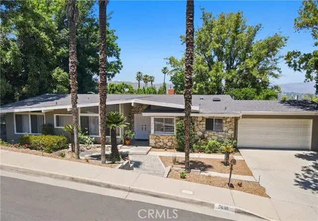 Immaculate mid-century Charles Du Bois VIEW home! Amazing opportunity to personalize or move right in! Located West of Valley Circle on an approx. 12,000 SF rare view lot that overlooks the Valley, mountains, and Warner Center! The single level property boasts wide frontage with mature palms and long driveway that leads to a 2-car attached garage with direct access, built-in storage, and new epoxy finished flooring. Step inside to find a wide formal entry with coat closet that opens to both the spacious living and dining rooms divided by the iconic floor-to-ceiling stone fireplace. Each room overlooks the incredible Valley vistas and boasts vaulted wood beamed ceilings with added skylights for extra natural light and wide sliding glass doors that open to the backyard perfect for indoor/outdoor flow. The kitchen has been upgraded with granite counters, stainless appliances, and newer cabinetry and also features two pantries and a cozy breakfast nook. The oversized primary suite has high vaulted ceiling, large wall-to-wall closet space, glass slider that opens to the yard, and private en-suite bathroom with dual sinks, walk-in shower, and separate bathtub. Two additional secondary bedrooms each have vaulted ceilings, good sized closets including a large walk-in, and both bedrooms share an en-suite bathroom with walk-in shower. The entertainers backyard features an expansive covered patio with fire pit, sprawling grass lawn, and breathtaking Valley, mountain, and city light views! Per seller: new roof (2023) and brand new HVAC system (2024). Adjacent to dining/shopping at the