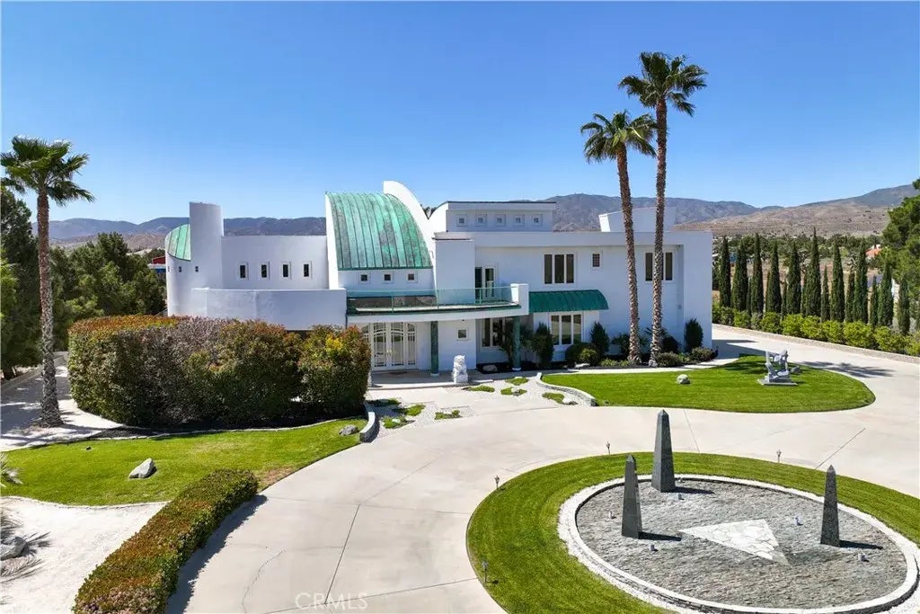 One of the most architecturally STUNNING homes in the Antelope Valley! This Contemporary Estate offers STEEL I-BEAM construction and over 7,100 square feet of living space situated on a 2.4 acre lot in West Palmdale. Enter through the private gate to an impressive landscape of art sculptures, palm trees, beautiful masonry, crushed marble, and a long circular driveway. GORGEOUS copper patina roof and other copper accents throughout. Grand entrance with cathedral ceiling and a step down formal living room with a wet bar and unique floor to ceiling windows! Dream kitchen with newly refinished cabinets, MASSIVE island, commercial grade Thermador range/oven, Sub-Zero refrigerator/freezer, 2 dishwashers and a walk-in pantry. The primary suite is suitable for royalty with a vaulted ceiling, private kitchenette, office area, dual sided fireplace, balcony and TWO walk-in closets that can fit an entire clothing store! PAID SOLAR panels and DIRT CHEAP electric bills due to a grandfathered rate program that STAYS with the property! Other features include a large gym with a built-in sauna, downstairs bedroom, formal dining room, theatre/bonus room and a 4 car garage with custom flooring and cabinets. The backyard has a sparkling inground pool and plenty of room for whatever your heart desires!
