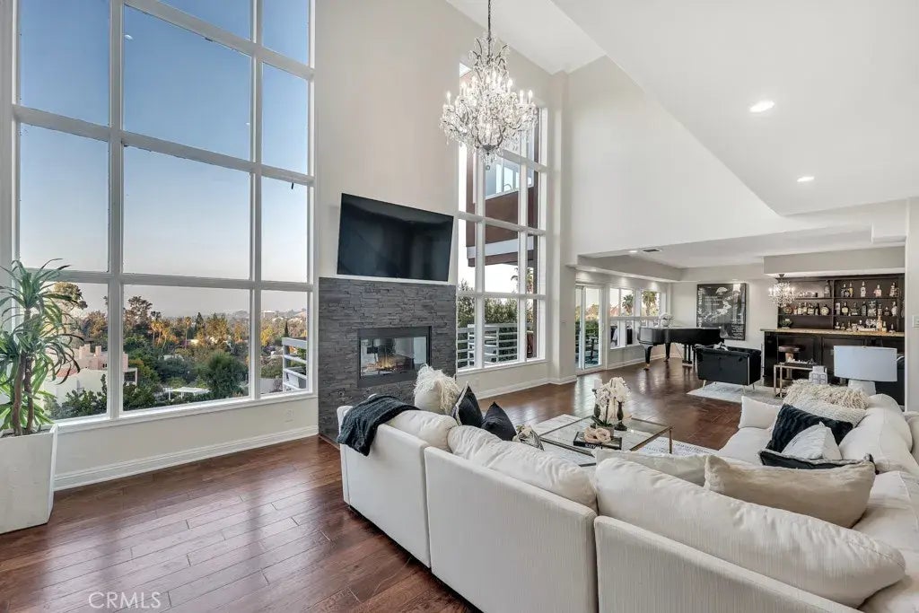 Dramatically situated on one of the most desirable streets in Woodland Hills-South and overlooking the entire San Fernando Valley, this custom-built 6-bedroom, 6.5-bathroom estate is the pinnacle of high-end luxury living. From the moment you step into the grand foyer, the property enchants with its seamless blend of modern elegance and breathtaking panoramic city views visible from nearly every corner of the home. Spanning an impressive 6,750 square feet, the interior is adorned with exquisite finishes, soaring ceilings, and massive windows that flood the space with natural light. Crisp lines and a warm, elegant flow define the design, which features a stunning gourmet chefs kitchen, an entertainers wet bar, a spacious private gym, and countless other exceptional amenities. The grand primary suite is truly a retreat, complete with a custom fireplace, an oversized walk-in closet, and a spa-inspired ensuite bathroom featuring a soaking tub. The suite opens onto a large private balcony, perfect for taking in the captivating views and the areas abundant wildlife. The enchanted backyard is a sanctuary, featuring mature trees, lush landscaping, a grassy yard, and unparalleled privacy. Three expansive viewing decks offer the ideal setting to entertain guests or simply relax while admiring the daily sunsets. The lower level of the home has its own private entrance and includes a full kitchen, laundry facilities, and two generously sized bedrooms. This versatile space can serve as a guest house, recording studio, executive office, or mother-in-law suite. Located within walking dist