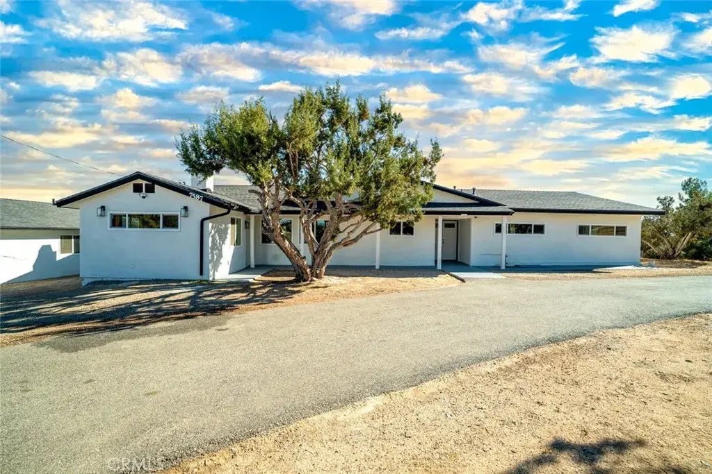 This meticulously remodeled ranch-style property in Hesperia offers an expansive 2,455 square feet of thoughtfully designed living space, featuring four spacious bedrooms and two and a half pristine bathrooms on a huge 3.5 Acre lot. The interiors showcase a modern aesthetic with vaulted ceilings, elegant wood flooring, and an abundance of natural light. The kitchen boasts stylish navy cabinetry, quartz countertops, and brand-new stainless steel appliances, seamlessly merging functionality with sophistication. The open-concept living spaces provide comfort and versatility, enhanced by a cozy fireplace, built-in shelving, and designer fixtures. The luxurious bathrooms are adorned with marble-like tile and contemporary finishes, creating a spa-like retreat. Outside, enjoy a tranquil backyard featuring a sparkling pool, perfect for relaxation and entertaining, alongside a covered patio for alfresco dining. The property also includes a large workshop garage space perfect for RV parking, ideal for hobbies, storage, or additional functionality. A detached 4 car garage is perfect for ADU, With its modern updates and serene outdoor setting, this property is ready to welcome its next owners to refined comfort and timeless charm.