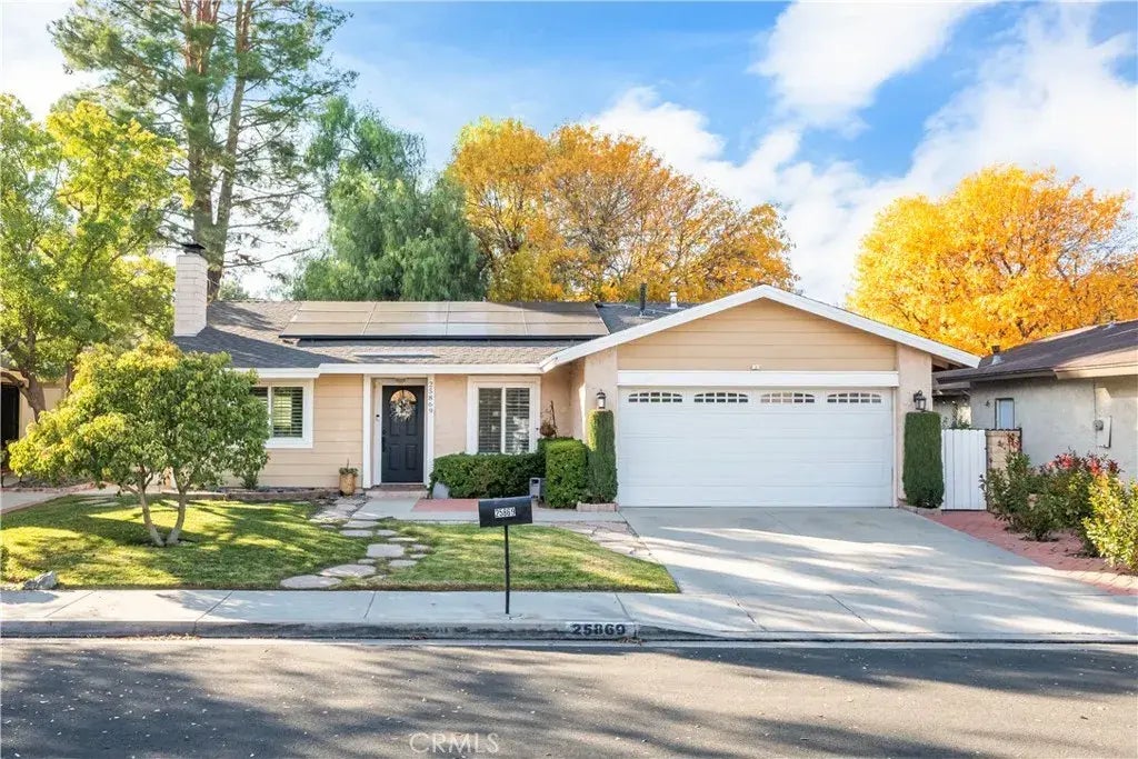 Updated Single-Story Home in the Heart of Valencia! Nestled on a quiet cul-de-sac, this charming 3-bedroom, 2-bathroom home is light, bright, and inviting. Step into the spacious living room featuring high ceilings, a stone fireplace, and newer engineered wood flooring throughout. The updated recessed lighting and neutral paint add to the home's fresh, modern feel. The open-concept layout has been enhanced by removing walls between the living room, dining area, and kitchen, creating a seamless space perfect for entertaining or family gatherings. The kitchen boasts white cabinetry, sleek stainless steel appliances, and a convenient breakfast bar. The spacious primary bedroom offers a large window with views of the backyard and an attached bath with a walk-in shower, newer vanity, and flooring. Two additional bedrooms share an updated hall bath with a newer vanity and flooring. The backyard, updated in the last 3 years, includes a covered patio, newer hardscaping, landscape lighting and hookups for an outdoor kitchen with hot and cold running water as well as sink ideal for outdoor enjoyment. A two-car garage with direct access provides convenience. Benefit from the recently installed solar power system, offering low monthly payments and energy savings. This home is ideally located just minutes from freeways, shopping, and dining, and offers easy access to the Valencia paseo system, which connects right at the end of the cul-de-sac. Enjoy the community pool and playground just down the block. No Mello-Roos and excellent schools make this a must-see home!