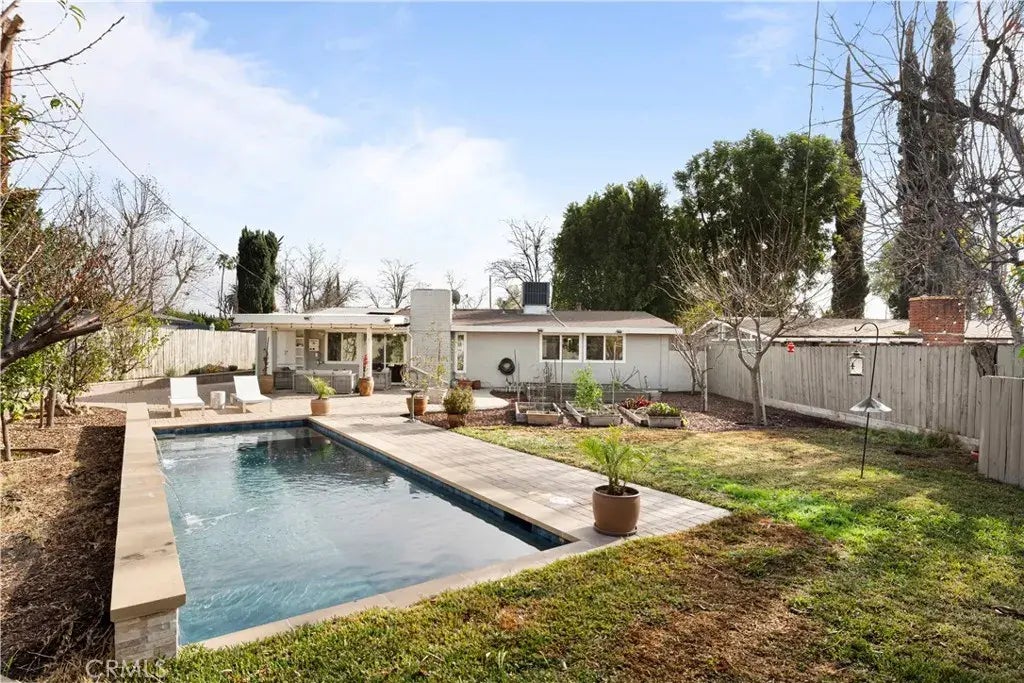 Looking for an energy-efficient mid-century home with dreamy outdoor space and a pristine pool? Look no further! Centrally located in the valley neighborhood of Reseda, this 3 bedroom, 2 bath bungalow embodies the beauty of single-level living on a large lot. Step inside to discover a freshly painted entryway, recessed lighting, a cozy gas fireplace, and no carpet! Enjoy the fully renovated kitchen, which shines with natural light, featuring high-end stainless steel Kitchen Aid appliances (including wall oven, stovetop, fridge, microwave, dishwasher), and granite countertops. The primary bedroom retreat is updated, offering ample closet space, a dedicated office, and a private bath for your personal oasis. With additional storage, this space caters to all your needs. Relax and rejuvenate on the inviting patio or by the stunning lap pool, all embraced by a beautiful and serene fruit and vegetable garden. Home also has FULLY-OWNED Solar panels and an EV Charger!