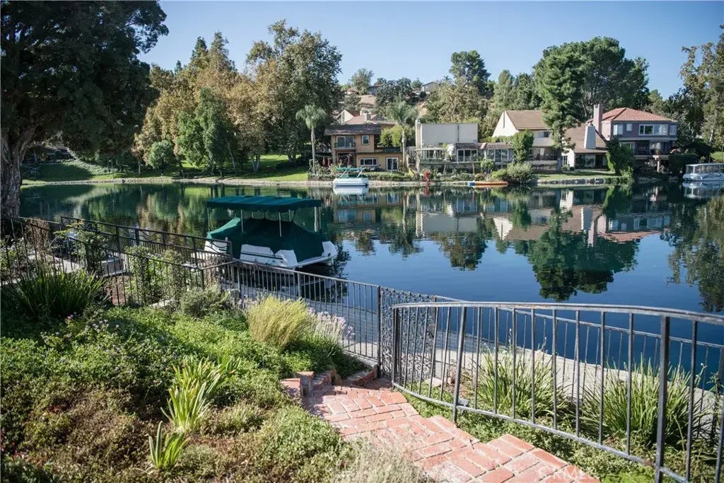 Absolutely charming town home for lease on Calabasas Lake. Three bedroom, three bath with 2068 sq ft. Gated courtyard entrance with double glass french front doors. Awesome manufactured wood flooring throughout the house. Step down to living room with vaulted ceilings, fireplace and sliding glass doors out to a charming covered patio with brick steps down to the lake. The view is breathtaking!! There is a small wet bar with wine rack, cabinets and drawers. Kitchen has ample counter space with white tile counters, gas range, microwave and quaint breakfast nook with glass door out to another patio with views of the lake. Dining room is located at the front of the house as you enter. Downstairs bedroom is set up as an office with built in desk/entertainment center. There is a separate laundry room with a large utility closet and a 3/4 bath with quarts counter top and lovely white vanity. The two upstairs bedrooms have vaulted ceilings, recessed lighting and their own bathroom. Master bedroom has glass doors out to a charming covered patio with lovely views of the lake, two closets, one being a walk in. Two car garage with storage. This amazing rental is in impeccable condition.