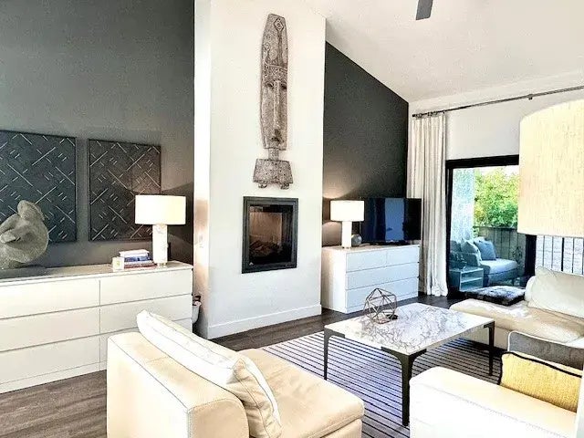 NEW IMPROVED PRICE! This South Palm Springs luxury one-bedroom condo on FEE LAND is in a desirable, desert- scaped, gated community in Deepwell with panoramic mountain views and walkable location near conveniences such as Smoketree, fine and casual dining and Koffi. The spacious 816 sq. Ft. floor plan was fully remodeled as a stylish retreat for full-time or occasional living. It offers high ceilings, modern finishes, a fireplace feature and ceiling fans, new doors and upgraded double pane windows. An efficient kitchen features chef-quality Bosch appliances, modern cabinetry and a waterfall quartz top seating four. New water heater in 2024. There is a full-size stacking washer/dryer combo, a full bath and a convenient second vanity. A private balcony has expansive views of the mountains. Rancho La Paz has 3 pools and spas, 3 tennis courts, 4 pickle ball courts and a dog run. 30-day rentals permitted.