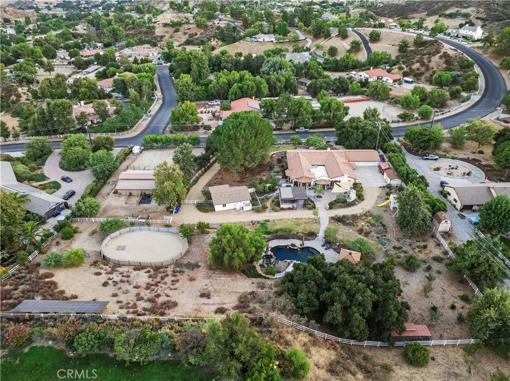 Welcome to the Sagedust Ranch! Nestled in serene Hasley Canyon, this stunning ranch-style estate spans nearly 2.5 acres, offering a perfect blend of luxury, comfort, and functionality. The main residence, with 4,388 square feet, features 3 bedrooms, 2.5 baths, an office, and a 3-car garage. The front yard is a landscaping masterpiece, with terraced gardens and hardscape steps leading up to a charming wooden front door. This door opens to a home where hardwood floors and exposed beams enhance the rustic elegance throughout. The formal living room, adorned with an adobe-style fireplace, flows seamlessly into a dining room ideal for gatherings. The expansive kitchen boasts a massive island, rustic cabinets, custom built-in refrigerator and freezer, and quartz countertops, complemented by a large Wolf range with a double oven and custom hood. Adjoining, the family room impresses with cathedral ceilings, exposed beams, and large windows that flood the space with natural light. The centerpiece is an elegant rock fireplace with a grand log mantel. A nearby game room, complete with a bar, promises endless entertainment. The primary bedroom is a private sanctuary with cathedral ceilings, exposed beams, and an en-suite bathroom featuring separate vanities, a custom tiled shower, and a jetted tub with tranquil views of the property and horse facilities. The estate also includes a charming guest house with 2 bedrooms, 1 bath, a kitchen, living room, and cozy front porch. Outdoor living is elevated with a spacious patio, built-in BBQ, prep area, outdoor fireplace, and automatic shade sc