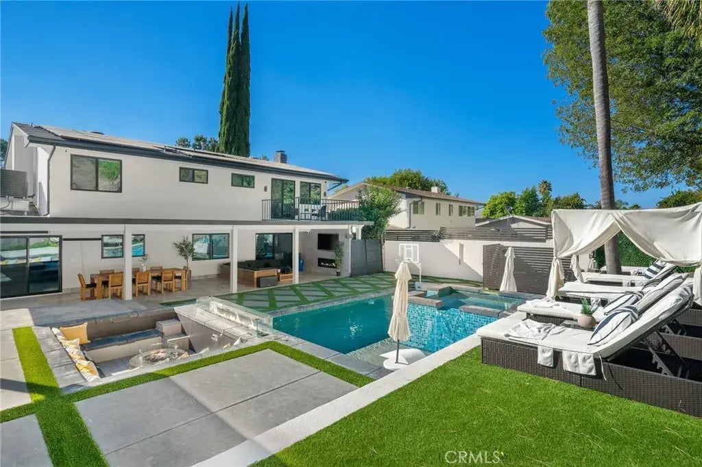 This modern, West of Valley Circle, Woodland Hills estate with a private outdoor oasis offers a luxurious living experience and is nestled a short distance from beautiful Hidden Hills. With 5 bedrooms and 5 bathrooms spread across 2,643 square feet of living space, this home sits on a huge lot of almost 15,000 square feet! Step into a world of unparalleled sophistication, where every detail has been thoughtfully curated for ultimate comfort. The recently completely renovated home showcases contemporary elegance throughout its expansive, open floor plan. At the heart of the home lies a state-of-the-art chefs kitchen, equipped with top-of-the-line appliances, a spacious center island with bar seating, and an exquisite wine display that adds a touch of refinement. The adjacent family room is perfect for relaxation, custom built-ins, and a high-end screen/projector for a cinematic experience at home. The grand dining room, with its elegant ambiance, is perfect for hosting sophisticated dinners. Featuring a resort-style backyard with a pristine new pool (and pool equipment) and elevated spa. A sunken fire pit invites cozy evenings under the stars, while the outdoor BBQ kitchen, complete with a new motorized smart patio awning, offers the ultimate alfresco dining experience. The luxurious primary suite provides a tranquil escape, boasting a private balcony with views of the lush backyard, a spacious walk-in closet, and a spa-inspired bathroom with premium fixtures, and a rain shower. This estate is equipped with modern amenities including FULLY PAID solar panels, an EV charging s