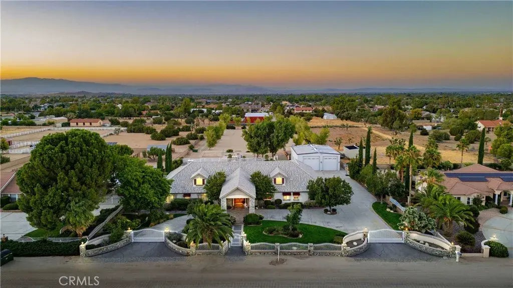 Welcome home to this luxurious single-story 2.5-acre estate in much-desired Shadow Acres in West Palmdale. This 4,677sq ft custom home features two electric gate entrances, a circular drive & porte cochere. Lush landscaping surrounds the home with park-like front and rear lawns, mature trees, shrubs, and rain gutter systems. The formal living area has an impressive clear-cut cedar ceiling and a floor-to-ceiling rock fireplace with a custom wood mantle. Family Room with projector, screen, sound system, and built-in entertainment center. Gourmet kitchen with rich granite, breakfast bar, Viking Range with a flattop, double ovens, indoor BBQ, steamer, Sub Zero refrigerator/freezer, and large walk-in pantry. There is a beautiful view of the front yard from the kitchen sink. The Interior has solid upgraded wood doors, wood floors, contemporary tile, and carpet. The primary suite has a relaxing retreat and dual fireplace. The primary bath features an impressive use of marble, a huge shower with two heads plus a rain head, a large jacuzzi tub, and dual sinksa separate massive en-suite on the opposite end of the home with its entrance and HVAC. Two additional bedrooms share a Jack and Jill bath with dual sinks. For entertaining this home has a stand-alone wet bar seating for six and a glass cabinet bar-back. Large laundry room with many cabinets, a sink, and a shower. With two covered patios, there are fantastic opportunities for outdoor living and entertaining. Built with 2x6 construction. Massive four-car garage with a checkered floor. RV garage shop with over 2,000 sq ft w/220 po
