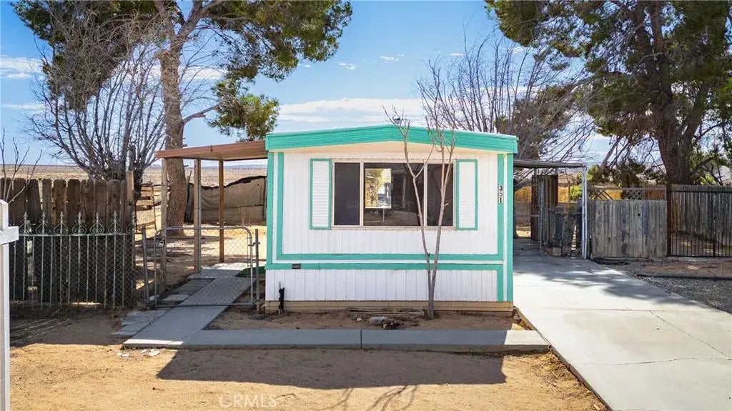 This property is situated in Mobile Home Village in California City. What sets Mobile Home Village apart is that the homes are placed on private lots of about 5,000 square feet, with no HOA fees or space rent! The mobile home is set into the ground, ensuring that the door entries are level with the groundno stairs or decks required. This charming mobile home measures 20'x60' and features 2 bedrooms and 1.5 bathrooms. It includes a covered patio, driveway parking, a spacious gated backyard, and a small shed. The property boasts several large trees, and the backyard offers plenty of space for RV storage, a garden, or a lawn. Enjoy beautiful desert views and easy access for hiking and off-roading. The seller is willing to give buyer's credit toward closing and is highly motivated. Mobile Home Village is conveniently located near the California City Golf Course, as well as a park that features a fishing lake, senior center, recreation center, and dog park. California City is a growing community with easy access to Edwards AFB, Mojave, Tehachapi, Lancaster, and Palmdale.