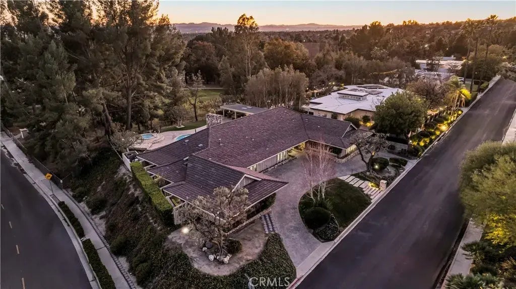 Welcome to this sprawling single-story estate located in the prestigious Knollwood Country Club. As you approach the home, the estate feel is immediately apparent, with a double interlocking paver driveway, mature landscaping, and wide streets leading to a beautifully landscaped lot. The grand entry, with its modern double French doors, opens to an expansive open-concept living area, highlighted by wall-to-wall windows that evoke a timeless mid-century aesthetic and frame stunning views of the backyard. The living, dining, and kitchen areas flow seamlessly together, all bathed in natural light. A striking 72-inch fireplace anchors the living room, complemented by sophisticated grey flooring throughout. The chefs kitchen is a true masterpiece, featuring under-cabinet lighting that accentuates the beautiful quartz countertops with bold black veins and smooth waterfall edges. It is equipped with high-end JennAir stainless steel appliances, white gloss cabinetry with black hardware, and two Moen faucets, blending style with functionality. Adjacent to the kitchen is a convenient laundry room. Guests will be impressed by the elegant half bathroom, which showcases a floating quartzite vanity and Spanish grey tile accents. The versatile executive office space is customized with bespoke cabinetry, unique stonework on one wall, and tile flooring, making it an ideal work space. On the homes east wing, three generously sized bedrooms await, two of which are en suite. The expansive primary suite is a true retreat, featuring three sliding doors that open to the backyard, providing direct