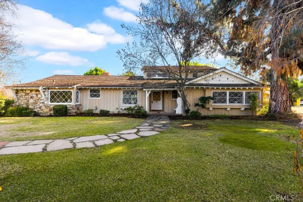 Nestled S of the Blvd in a picturesque Woodland Hills neighborhood, this expansive 5-bed, 3.5-bath home spans 2,954 sq. ft. on a generous nearly 13K sq. ft. corner lot. Boasting exceptional curb appeal, the property is framed by vibrant landscaping, towering trees including mature citrus, & sprawling lawn accented w/ elegant stone walkways. Retaining its original charm while offering immense potential for contemporary updates, the home features hardwood floors in the main living areas, all-new interior paint, smooth ceilings, & recessed lighting. The inviting entry leads to a spacious formal living room, bathed in natural light from oversized glass doors that open to the backyard, where a sparkling inground pool & an expansive patio awaits. A striking floor-to-ceiling stone fireplace adds warmth, while the adjacent family room impresses w/ soaring beamed ceilings, a massive corner brick fireplace, & rich wood accents with built-in bookshelf. The sunlit breakfast nook offers a view of the verdant front yard & is complemented by a built-in butlers pantry. The kitchen, perfectly situated between the breakfast nook & formal dining room, provides abundant storage, double wall oven, & gas cooktop beneath a striking copper range hood. Three bedrooms reside on the main level, including the grand primary suite, which boasts a wall of windows & an en-suite bath w/ a dual-sink vanity. One guest bedroom enjoys private backyard access, while another sits adjacent to a well-appointed 3/4 hall bathroom. Upstairs, two additional bedrooms showcase dramatic cathedral ceilings, one featuring