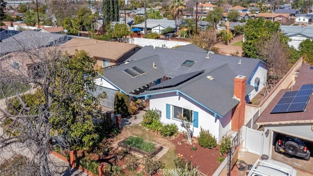Classic 4 bed, 2 bath, 1,845 sq ft mid-century, ranch style home in a friendly residential neighborhood in Woodland Hills. Full of wonderful period touches this home is just waiting for its next occupant to make it their own! The home offers the benefit of solar panels for energy cost savings, tile floors, ceiling fans, and ample natural light throughout. Invitingly verdant front yard is gated with metal fencing and brick pillars, leading to a long walkway that guides you to a striking double-door entry. Inside, the formal entryway boasts a natural slate floor and a skylight, setting the stage for the warm mid-century ambiance. Step down into the spacious living room, where a stunning natural stone fireplace with a raised hearth becomes the focal point. Another versatile room offers flexibility, whether used as an informal living area or a formal dining room featuring slate flooring and a glass slider opening to the expansive backyard. The updated kitchen impresses with granite counters, rich wood cabinetry, a built-in gas range and a conveniently located washer and dryer, while a sunny breakfast nook invites casual dining. A large primary suite boasts dual closets and an en-suite bath. Three additional sizable bedrooms, two with wall-unit ACs share a full hall bath. Outside is a backyard designed for relaxation and entertaining, complete with a large slate patio, a brick walkway, mature landscapingincluding abundant fruit treesa covered hot tub on a raised platform, and plenty of space to enjoy the outdoors or reimagine the space. The attached two-car garage provides addi
