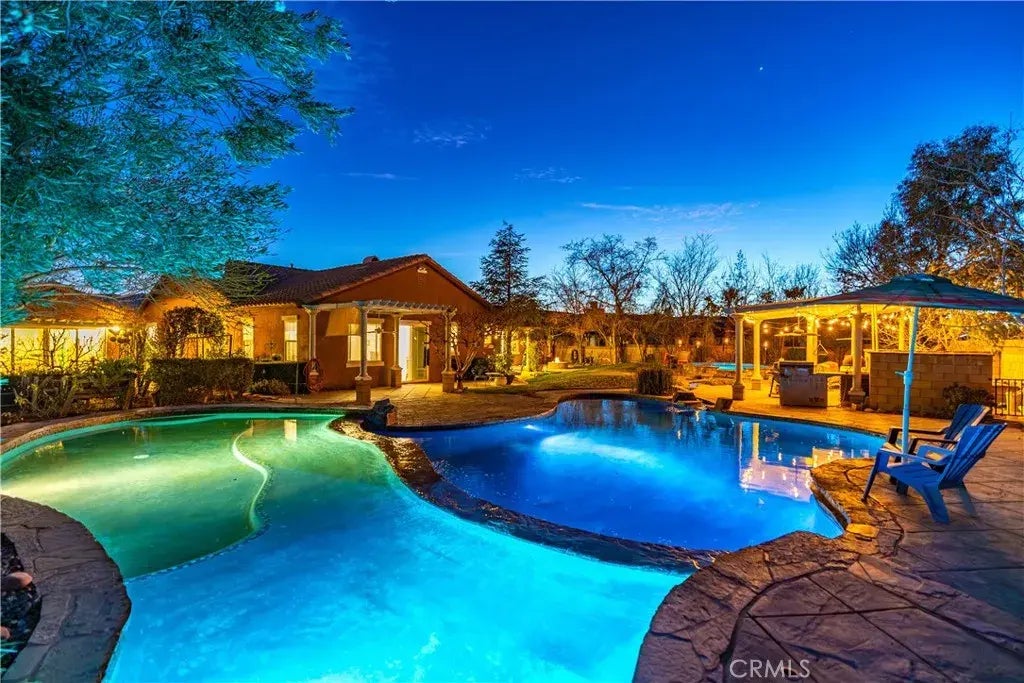 ***LIVE BEAUTIFULLY*** Exquisite 5-Bed, 5-Bath Estate with a one-of-a-kind Resort-Style Backyard in the Premier Collections! Welcome to this stunning single-story estate, offering nearly 3,800 sq. ft. of meticulously designed living space in the highly desirable Premier Collections neighborhood. With no HOA and no Mello-Roos, this home provides luxury, privacy, and unparalleled amenitiesperfect for multi-generational living or those who love to entertain. Interior Elegance & Versatile Layout. The gourmet kitchen features granite countertops, stainless steel appliances, double ovens, a gas cooktop, a built-in microwave, and a spacious walk-in pantry. The oversized kitchen island boasts solid quartz surfaces and a breakfast bar, seamlessly flowing into the open-concept family roomadorned with custom lighting fixtures and high-end engineered hardwood floors. Five spacious bedrooms, including a large office/den, provide ample space for work, relaxation, and comfort. Resort-Style Backyard An Entertainers Paradise. Step outside to your private oasis, featuring a one-of-a-kind, massive 25-seater spa, a serene river flowing into the main pool, and a connecting kids poolcreating the ultimate resort-style retreat for all ages. A fully permitted pool house/cabana with a bathroom adds convenience and charm. The side yard is a gardeners delight, showcasing fruit trees, grapevines, and even a chicken coopblending nature with luxury. The lush landscaping, trellises, and tranquil water features offer a peaceful escape from everyday life. Enjoy the benefits of an extensive, fully paid sola
