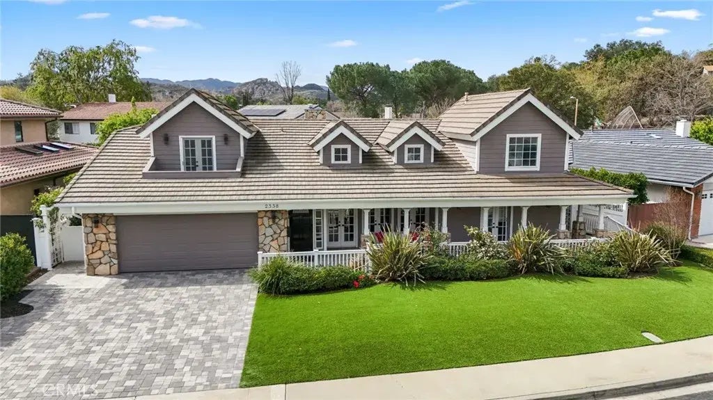 Welcome to this storybook home in Westlake Village just a stones throw from the breathtaking water channels and nestled on a peaceful cul-de-sac. With its sprawling front lawn, stone & wood accents, and elegant rooftop silhouettes, this homes curb appeal is truly special. Mostly SINGLE-STORY, this home is located in the desirable Village Homes community and boasts a spacious 2782 sf. of living space with 3 bedrooms plus a separate dedicated office/gym downstairs with French doors that overlook the front yard, providing a quiet haven for productivity or creativity. The large front porch is perfect for taking in the morning mist. And as you enter the home, you are wowed by 2 STORY TALL vaulted ceilings that create an abundance of natural light throughout. The home has been recently updated with tasteful contemporary flourishes. The formal living & family rooms are separated by a 3-sided modern fireplace which stretches up to the ceiling. The home has new vinyl flooring throughout including the stairs and new railings. The living areas, kitchen and rear primary suite are also centered around a charming atrium that features a serene Zen fountain. What is extremely unique about this property is that it has 2 spacious primary bedrooms on either side of the home, each with its own FULLY REMODELED en-suite bathroom. This offers unique privacy and versatility. One of the primary bedrooms features a floating bathtub for ultimate relaxation, and a separate walk-in shower, its own updated fireplace, a walk-in closet and access to the yard. Upstairs you will find an additional en-suit b