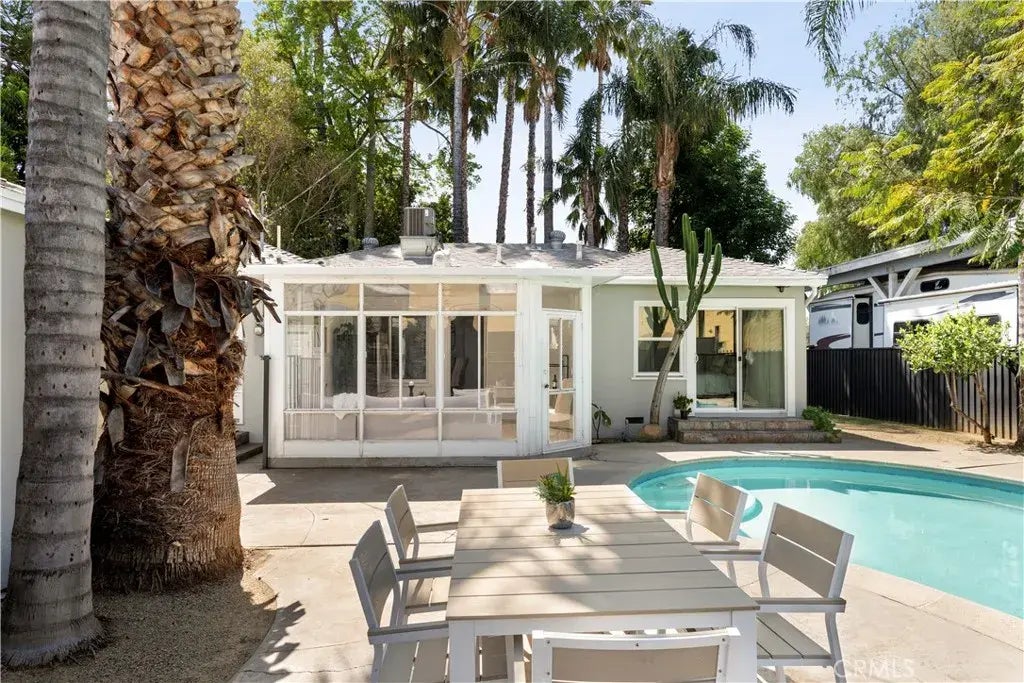 This gorgeous, freshly painted 3 bedroom home is ready to be your private oasis! Located in prime Lake Balboa, and situated behind a sleek, modern, metal fence, this bungalow retreat features a sparkling pool below palm trees, a detached garage, and a sunroom, perfect for year-round enjoyment. Inside, you'll find fresh interior paint, gleaming hardwood floors, and an abundance of natural light from newer windows. The kitchen has stainless steel appliances and is attached to the upgraded laundry room with sink. So many modern renovations have been made, including a new HVAC system with updated ducting, a tankless water heater, and a new sewer line. The drought-tolerant landscaping enhances the curb appeal while keeping maintenance low. Alley access in the back makes adding an ADU a breeze, offering incredible investment potential. Located just minutes from the 101 and 405 freeways, Lake Balboa Park, the Sepulveda Basin, and the vibrant shopping and dining scene on Ventura Blvd.