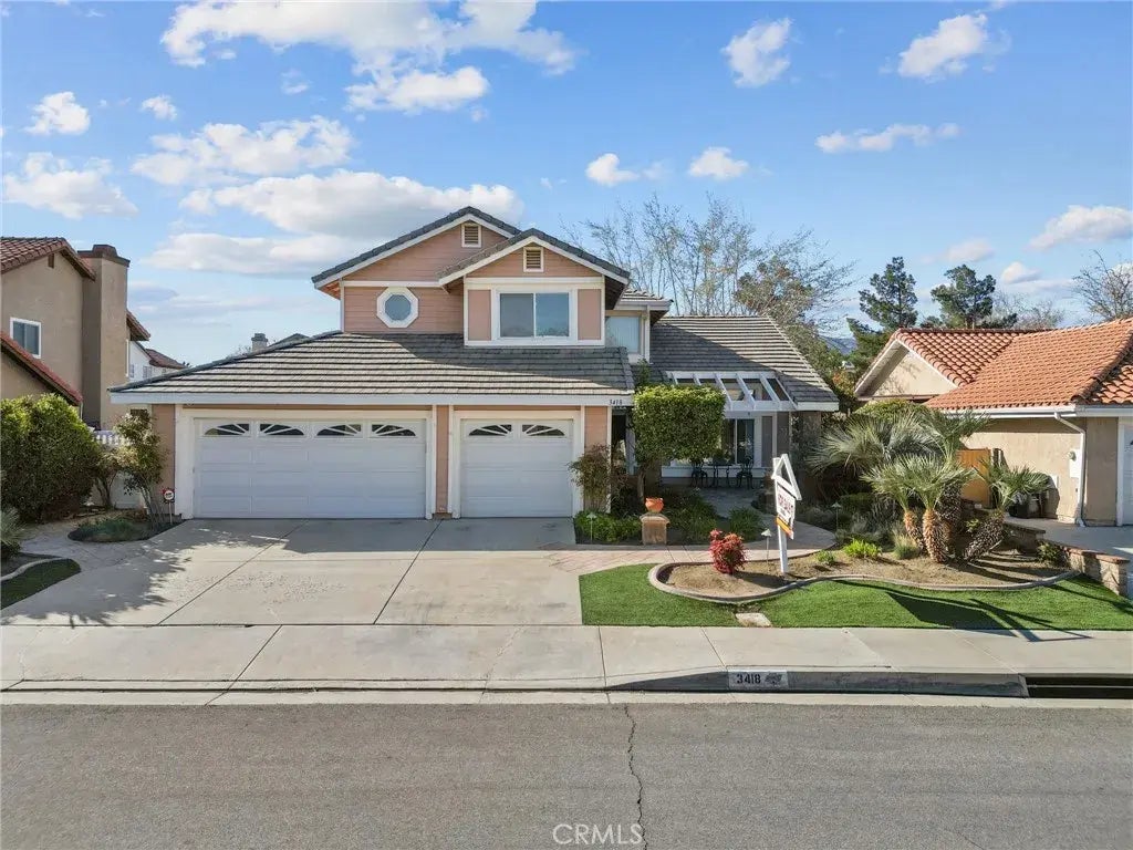 Stunning 4-bedroom, 3-bathroom residence nestled in the desirable West Palmdale neighborhood. This meticulously maintained home offers the perfect blend of comfort, style, and functionality, ideal for families and entertainers alike. Step inside and discover a spacious layout with vaulted ceilings, a living room and separate family room perfect for larger families or entertaining. Enjoy a highly desirable downstairs bedroom/office featuring elegant double glass door entrance, perfect for guests or a dedicated workspace. The heart of the home boasts ample living space, flowing seamlessly into a modern kitchen with a moveable custom island, stainless steel appliances, wine fridge, 5-stage water filtration and lush green views of the yard from the sink. Upstairs are 2 bedroom joined by a jack and jill bathroom. Primary suite features double door entrance, vaulted ceiling, large windows offering natural lighting, a nook and a spacious bathroom with walk-in closet. Enjoy a generous 3-car garage with a pass-through to the rear of the property and dedicated 220V. AC and HVAC replaced within the last 5 years! Outdoor living is redefined in this property. The front yard is a low-maintenance oasis, showcasing vibrant turf grass, elegant stamped concrete pathways, and drought-tolerant plants, creating a picturesque setting for your morning coffee on the charming front patio. The expansive backyard is an entertainer's dream, featuring a giant cobblestone patio shaded by approximately 1600 sqft of aluminum lattice, perfect for hosting gatherings and creating lasting memories. Lush green