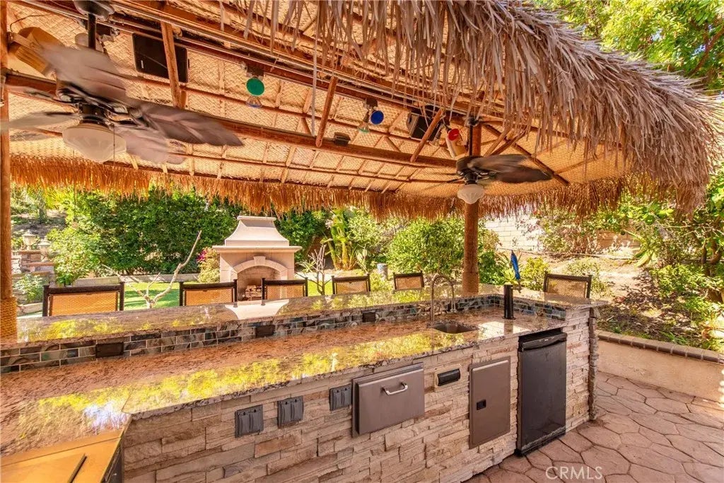 JUST IN TIME FOR SUMMER! Welcome to this STUNNING 4 BED 4 BATH + PLUS DOWNSTAIR OFFICE (POSSIBLE 5TH BEDROOM) and DOWNSTRAIR MUSIC ROOM (POSSIBLE 6TH BEDROOM)! This Spanish-style luxury home, a true gem for those who appreciate elegance and the art of entertaining awaits. A meticulously designed backyard that feels like a private island retreat, offering an unparalleled escape from the everyday. Inside you'll find a beautiful iron staircase with Spanish tile as you enter. The formal living room features bamboo flooring and high windows, creating an inviting and airy atmosphere. Throughout the home, extravagant archways add a touch of grandeur, including one that opens to the formal dining area with a hutch nook and French doors. For remote workers, a separate downstair office provides a quiet and productive space away from the main living areas. This can also be used for guests or mother in-law quarters. The home also includes indoor laundry, three-car garage with a workshop area and new water heater. The whole house water purifier ensures clean, fresh water throughout the home, while dual A/C units (upstairs unit is brand new) and surround sound wiring enhance comfort and convenience. The gourmet kitchen is a chef's delight, featuring a large island/bar with 18 tile flooring, a 5-burner Wolf stove, a new Bosch dishwasher, travertine backsplash, double oven and generous walk-in pantry with additional storage under stairs. The kitchen opens into a family room with wood flooring and a breakfast area that includes an office/homework nook. Upstairs, the home offers well-designe