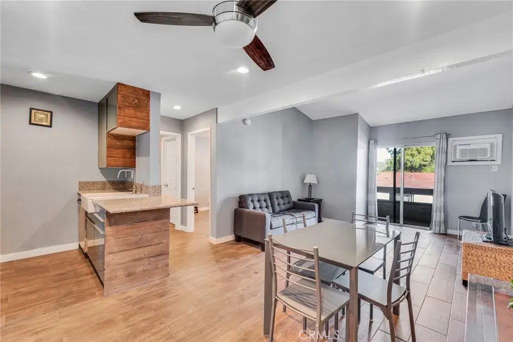 Welcome to this beautifully updated 1-bedroom, 1-bathroom top-floor corner unit condo in the desirable Olive Creek gated community of Canoga Park! With 511 sqft of well-designed living space, this home offers modern upgrades, abundant natural light, and a fantastic open floor plan. Step inside to discover a spacious living room with soaring vaulted ceilings, recessed lighting, and sleek wood-like flooring that extends throughout. The living room and dining area enjoy ample sunlight from the sliding patio door, creating a bright and inviting atmosphere. The spacious outdoor patio, accessible from the living room, spans the full length of the unit, providing the perfect space for relaxation, outdoor dining, or enjoying fresh air. The updated kitchen features newer cabinets with plenty of storage, granite countertops, a farmers sink, and all essential appliances. A ceiling fan, newer in-wall A/C unit, and a convenient storage closet add to the units functionality in the common area. The bedroom is generously sized and includes a walk-in closet, recessed lighting, and a window that connects to the expansive full-length patioperfect for enjoying fresh air and sunlight. The ensuite bathroom boasts an extended vanity, updated flooring, a full shower, and dual entry points for added convenience. Olive Creek offers fantastic amenities, including a large pool and spa, multiple laundry rooms, gated and covered tandem parking, a secure mail room, and multiple gated entrances for peace of mind. This move-in-ready home is perfect for first-time buyers, downsizers, or investors looking fo