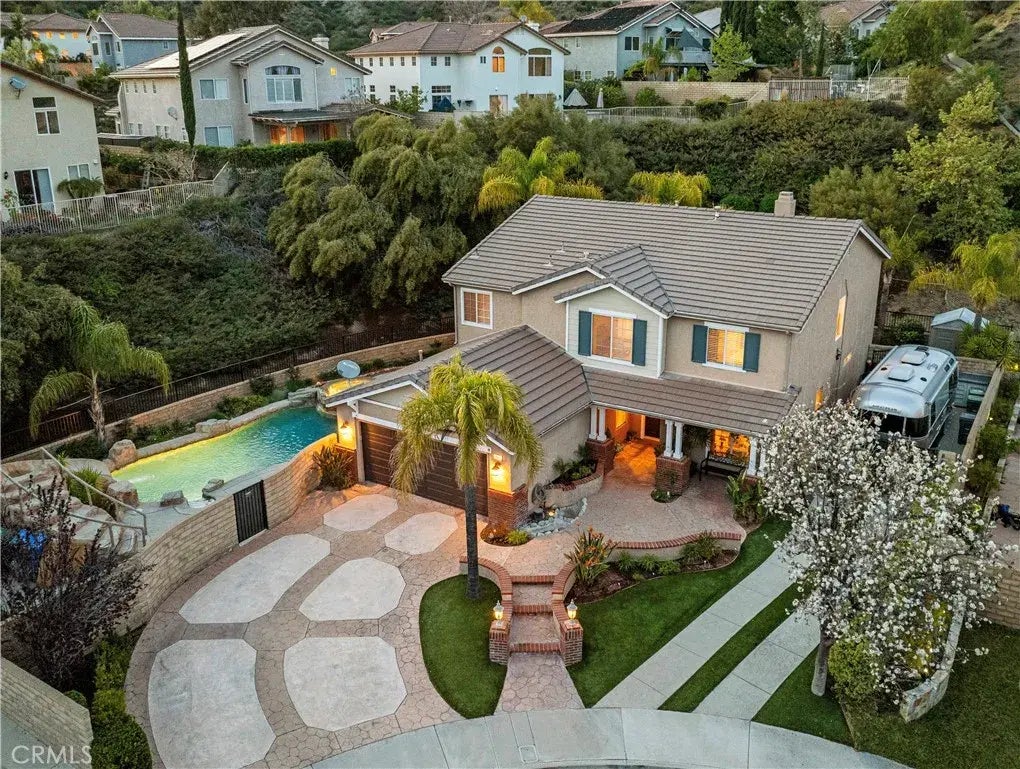 Spectactular POOL home with dedicated RV PARKING ideally situated at the end of the cul-de-sac near the top of Hillcrest with NO HOA or Mello-Roos! The beautifully landscaped front yard provides stunning curb appeal with its dedicated ribbon driveway for your RV parking and charming front porch. Upon entering the home, you're welcomed into the largest floor plan in this tract with 5 beds, 3 updated FULL bathrooms, with one bedroom and bath downstairs perfect for live-in guests. The entire first floor is adorned with newly installed, wide luxury vinyl plank flooring greeting you through the living room and formal dining room as you walk through to the separate family room with a cozy brick fireplace and large ceiling fan. Your large kitchen features a separate dining area, a breakfast bar island with modern pendant lighting, black quartz countertops, mosaic tile backsplash, a plethora of white soft-close cabinetry with matte black hardware (newly installed in 2024), a large single-basin stainless steel sink with modern pull-down faucet, and stainless steel appliances including a built-in range, microwave, and dishwasher. Adjacent to the kitchen is a very spacious laundry room/mudroom with direct access to your 2 car garage. Backyard sliders provide access to your private backyard with no rear neighbors and perfect for entertaining with your built in BBQ and sparkling pool with rock slide and above ground spa guaranteed to make you feel like you are having a staycation every day. There is also a dedicated 50 amp service in your RV parking area! Head upstairs with newly instal