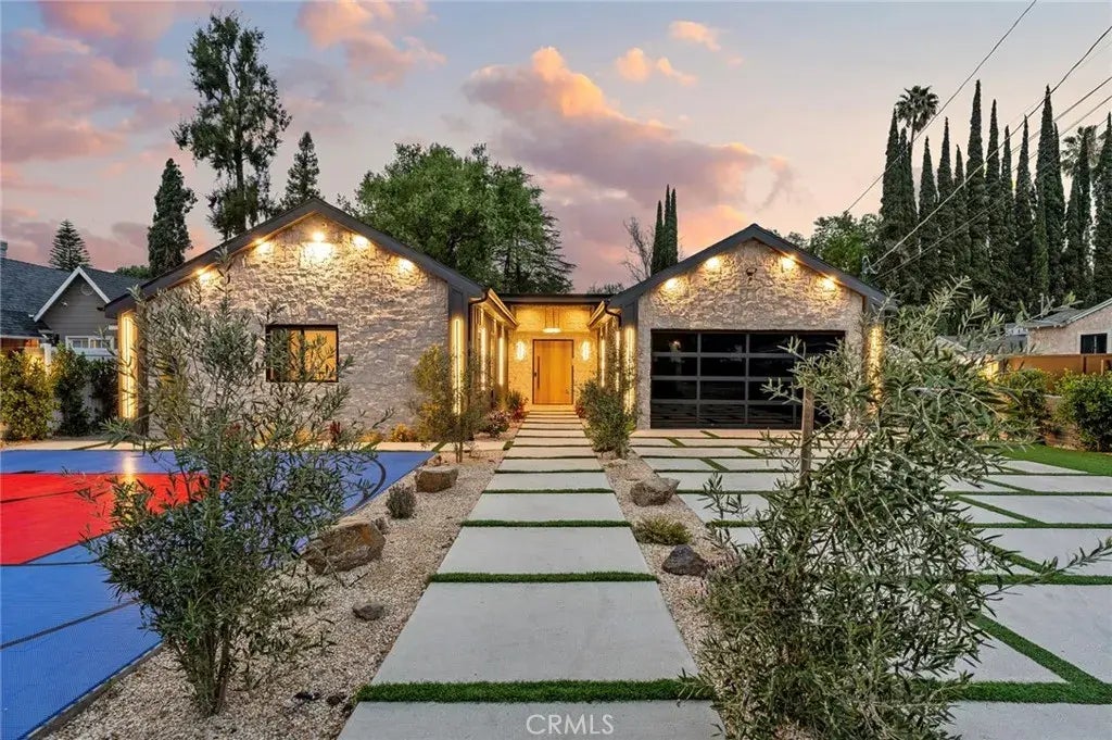 Spectacular privately gated Walnut Acres estate completed in December 2024! This sprawling one level reconstruction boasts completely reimagined interiors with immaculate attention to detail, designer finishes, and gorgeous imported materials. The property is set back from the street with automatic gate and pedestrian access that open to the spacious front yard with sports court and long driveway that leads to the finished 2-car garage with built-in storage. Paved pathways with meticulous landscaping and lined olive trees lead to the front exterior adorned with Casa Blanca rough cut stone. Grand entry foyer has custom wood paneling and large pivot door that leads to a completely open floor plan with soaring ceilings and sunlit picture windows. Oversized family room features a gorgeous custom Terrazzo marble fireplace flanked by built-in cabinetry and two sets of sliding glass doors that open to the backyard perfect for indoor-outdoor entertaining. The stunning open kitchen boasts center island with breakfast bar seating, custom Espanola soft close cabinetry imported from Spain, honed Taj Mahal stone counters with seamless integrated sinks, paneled Fisher & Paykel 48 Fridge/Freezer & built-in range with double ovens and 6-burner stove with griddle, plus walk-in pantry. Separate dining area off the kitchen has stone accent wall, imported Alabaster marble lighting fixture, and wine display closet. The primary bedroom features high vaulted ceilings, wide plank Milan oak wood floors, large walk-in closet with custom built-ins, and private en-suite bathroom with Taj Mahal stone c