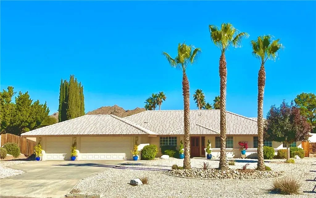 Beautiful Desert Knolls home on 0.5 acre. This 2,601 Sq ft home features an open floor plan, primary suite and 3 generous bedrooms. Formal living and dining rooms surround the well-lit entry. The entire home has a common oak finish to doors, kitchen, bathroom, laundry and three hallway cabinets. Tile and wall to wall carpeting can be found throughout the house. The center piece of the home features an open style kitchen, dining area, family room with vaulted ceiling. A brick gaslit fireplace heats the entire space and creates a warm family environment for preparing meals, dining and entertainment activities. In addition, there are French doors that open to the covered patio and expansive back yard areas. Perfect for a party that extends to the outdoors. The large primary suite features a sliding glass door to the patio, his and her vanity, separate shower and bathroom area with toilet. Behind two mirrored sliding doors, youll find a spacious walk-in closet with ample space. From the curb, This home shines behind 6 well-trimmed palm trees and desert landscape. The rock garden design is accompanied by trimmed hedges and fresh potted plants. The home is move in ready.