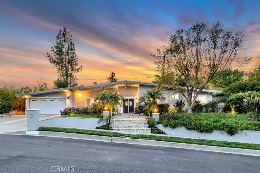 Well situated on a residential cul-de-sac in Woodland Hills, just adjacent to Calabasas & Hidden Hills w/ award winning schools, this striking mid-century modern residence blends timeless design w/ thoughtful modernization. Amazing curb appeal & stunning, professional landscaping including delightful touches like the stone step walkway & coordinated ribbon in the drive. The home offers hardwood flooring, crown molding, recessed lighting, & distinctive decorative flourishes throughout. Double front door opens to a formal entry & on through a versatile, open floorplan where every space connects w/ effortless ease. The large & inviting living room showcases a gorgeous fireplace w/ stone surround & custom wood mantle, plus French doors to back patio. The formal dining room offers a 2nd fireplace, built-in dry bar, delicate decorative ceiling work, & French door access to the patio. A large archway links the space w/ an intimate den area, perfect for informal gathering or cozy nights in. The kitchen impresses w/ granite countertops, SS appliances including a double oven & gas range, a central island w/ prep sink, & ample space for casual dining. A convenient guest powder bath offers tumbled stone tiles. Down the hall are 4 bedrooms, 1 of which has been converted into a library & could easily revert to a true bedroom. It shares a bath w/ the adjacent bedroom, while a third bedroom offers new carpet, walk-in closet, & a brand new en-suite bath w/ Calcutta type marble. The spacious primary suite has new carpet & offers a private sitting area, French-style sliding doors to the back