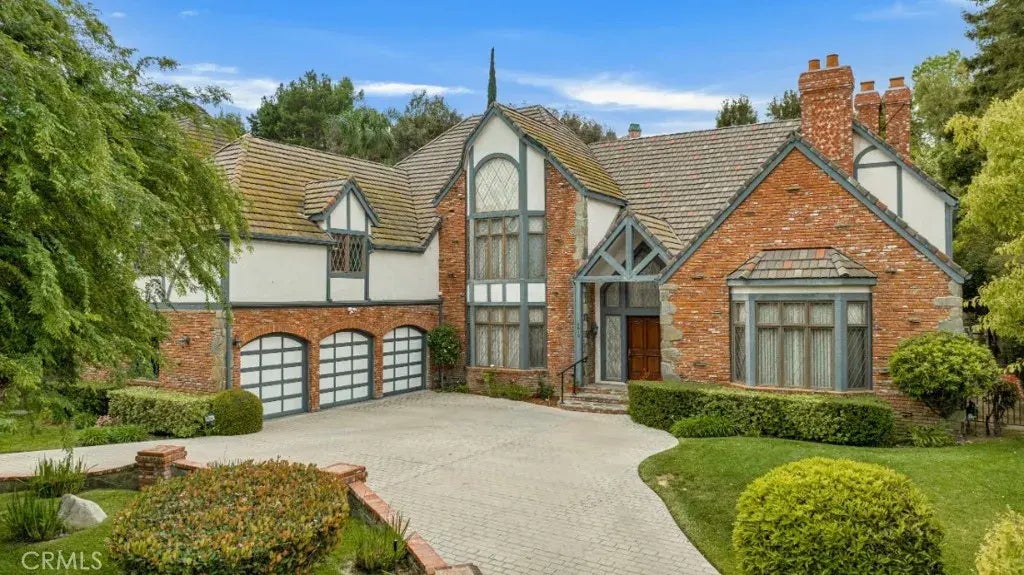 Situated in the prestigious guard-gated enclave of Westchester County Estates in Woodland Hills, this expansive 6-bedroom, 5.5-bathroom Tudor residence offers 6,941 sq ft of living space on a nearly 19,000 sq ft lot. Rich with architectural character & timeless craftsmanship, the home offers endless potential for personalized updates to create your dream space. Enter to a dramatic foyer featuring soaring ceilings, a split staircase, floor-to-ceiling windows, & recessed dome ceiling crowned by a striking chandelier. The formal living room impresses with cathedral beamed ceilings & a grand inset brick fireplace. The adjacent study provides a quiet retreat with built-in shelving. A formal dining room with a coffered ceiling flows into a butlers pantry leading to a generous kitchen outfitted with center island & prep sink, double oven, gas cooktop & grill, & filtered water sink with a view of the gardens. The turret-ceiling breakfast room, bathed in natural light through floor-to-ceiling surrounding windows, overlooking the backyard. The spacious family room includes beamed ceilings, another floor-to-ceiling brick fireplace, French doors to the exterior, a corner wet bar, & connects seamlessly to a card room adorned with custom built-ins, copper & coffered ceilings, & additional outdoor access. Adjacent to the staircase, a doorway reveals a basement storage area with stone walls ideal for a wine cellar. The main level also offers a convenient powder room, laundry room, & two bedrooms with a shared Jack-and-Jill bathroom. Upstairs features expansive windows overlooking the groun