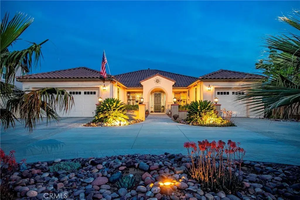 Pride of ownership boasts throughout this single-story, 3,019 sq. ft. Pulte-built estate. Offering 4 beds + a bonus room and 3 full baths. Situated on a sprawling 20,042 sq. ft. lot that offers paved RV access with an electric gate, clean out, and a 220-volt outlet. The front yard consists of a low-maintenance landscape with drought-resistant plants, a concrete circle driveway, landscape lighting, and a covered front porch. Enter the home to appreciate the upgrades of luxurious hardwood flooring, plantation shutters, recessed lighting, and a fresh coat of paint throughout. This open floor plan offers a formal living and dining room, a family room with a gas fireplace, and built-in shelving. The kitchen is both functional and beautiful, with granite countertops, stainless steel appliances, a double oven, a newer dishwasher, custom cabinets with pull-out shelving, a buffet countertop, a walk-in pantry, an island, and a dining area. The split-wing floorplan has the primary suite, a bedroom, and a full bathroom on the east wing, whereas the west wing offers three bedrooms and a full bathroom. There is also a bonus room that could be used as a 5th bedroom or office space. All bedrooms have neutral color carpet and oversized closets. The primary bedroom has French doors leading to the backyard and a large walk-in closet. The en-suite bathroom has a vanity with dual sinks, a jacuzzi tub, and a walk-in shower. The indoor laundry room has multiple cabinets, a countertop, and a sink. Step out back to your own piece of paradise and enjoy the full-length patio cover, custom-stamped con