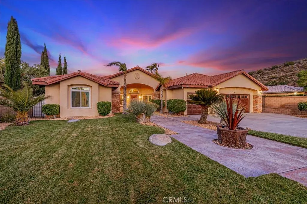 CUSTOM HOME PERCHED ON A RARE VIEW LOT in the FOOTHILLS of RANCHO VISTA. Nestled on .75 acre with sweeping view of the Antelope Valley. There is a long private drive up to this Contemporary Spanish-Style Single Story flanked by beautiful palms and green lawn space. This single-story plan is well-appointed with quality features of solid wood flooring, ample windows, great lighting, tile finishes and granite counters. The amazing floor plan for 3,186 Sf of living space features 4 Bedrooms and 3 Bathrooms, grand living room with view wall of windows and doors opening to the stunning outdoors. The family room offers a unique floor to ceiling stacked stone fireplace wall, access to a side patio and a large view window. Chef's kitchen is perfect in design with a center island/serving bar, ample cabinetry, stainless appliances, hooded range, coffee bar, and plenty of gorgeous counters. The formal dining area convenient to kitchen and complete with it's own view. All bathrooms are upgraded with appealing tones and finishes. The spacious primary suite is perfect with a walk-in closet, extra storage cabinets, granite counters and, a deep soaking bathtub. The secondary bedrooms feature a Jack-n-Jill design. An outdoor oasis awaits with pool, spa, tons of patio space, an outdoor fireplace, lounge and lawn areas plus a separate area for fruit trees and garden areas. In addition, there is a 3-car garage, solar system, planters and stained concrete walks. The Rancho Vista area offers well-maintained neighborhoods, good schools, shopping, dining and easy freeway access.