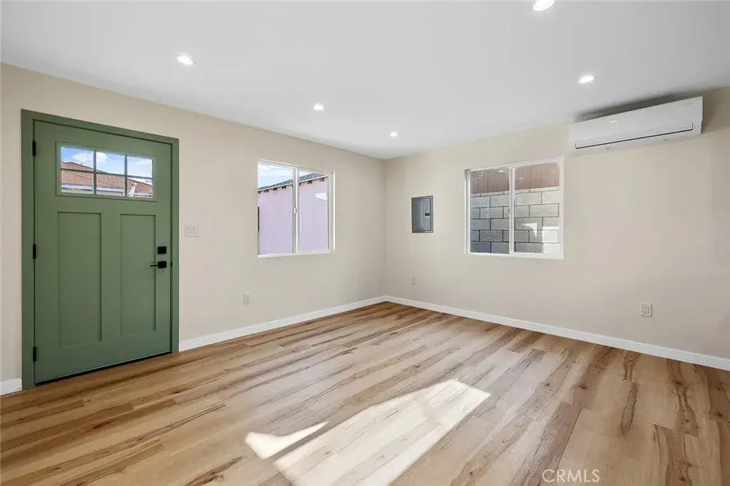 This newly constructed two bedroom, one bathroom home embodies modern comfort and style. Situated in a vibrant neighborhood, it offers convenience and charm. Upon entering, you will be greeted by a bright and spacious living area, ideal for entertaining. The contemporary design features an open floor plan with freshly painted walls, recessed lighting, new vinyl flooring, new windows, new mini split unit, and washer and dryer for added convenience. The kitchen is contemporary with new mint custom colored cabinetry with gold hardware, herringbone porcelain mosaic backsplash, quartz countertops, and brand-new appliances (refrigerator and range is included). Both bedrooms are bathed in natural light, spacious, and have well-sized mirrored closets. The bathroom showcases stylish design with modern beautiful tile flooring, and a vanity. Do not miss the opportunity to experience luxury living in South Gate.