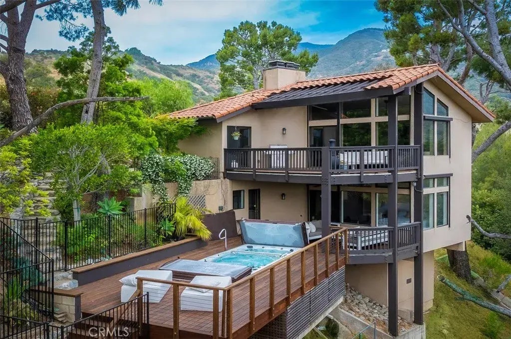 Spectacular hillside property in the highly desired Verdugo Woodlands. Unprecedented mountain views from multiple terraces and across the nearly half an acre lot, with private outdoor spaces including tranquil pathways and a large outdoor patio for entertaining under a California Oak. Set behind lush Ficus for privacy, this tranquil sanctuary welcomes you with a Koi Pond and flagstone paths framed by desert-inspired hardscape. Double doors open to a formal entry where rich hardwood floors, recessed lighting, and a brick fireplace create a warm, inviting ambiance while expansive walls of glass capture dramatic views of the neighborhood and the San Gabriel mountains. Extending from the expansive living room is a generous balcony ideal for enjoying breathtaking sunrises and dramatic sunsets - the perfect backdrop to entertaining in this architectural beauty with modern refinement. Vaulted ceilings, skylights, propeller ceiling fans, and commercial-grade automatic shades enhance the areas atmosphere. The custom chefs kitchen is a culinary dream showcasing a honed leather granite island with seating, stone backsplash, pendant lighting, and high-end appliances. The adjoining formal dining room and breakfast areas both contain sliding doors that open to expensive decks ideal for al fresco dining. The second fireplace anchors the cozy den with both panoramic views and an abundance of natural light that transitions beautifully into the evening, setting the mood for unforgettable nights. The serene primary suite features its own private balcony that captures breathtaking mountain vie