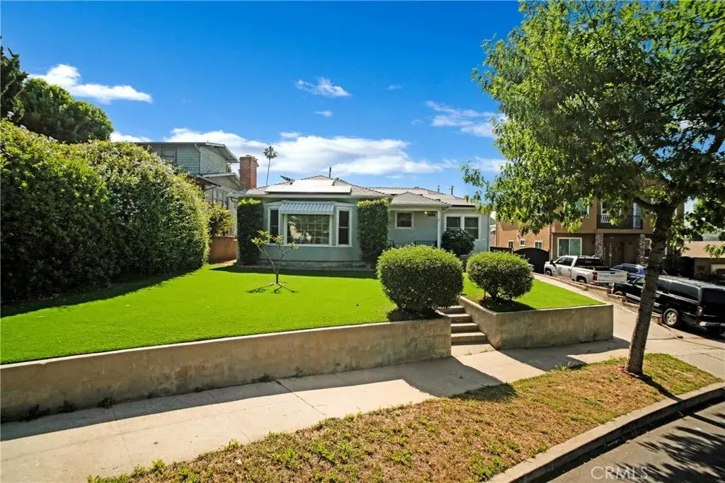Newly updated 3 bed, 1 bath, 1940s bungalow with generous 1 bed, 1 bath Guest house in tree-lined residential neighborhood in Eagle Rock. Owned solar panels for great energy savings! Great curb appeal with a raised yard, drought conscious artificial, turf lawn, and stamped concrete walkway lined with contemporary lighting. This home offers period aesthetic appeal blended with modern sensibilities and comfort. Refreshed inside and out with new paint, floors, doors, and more! A covered front porch, perfect for relaxing and enjoying the neighborhood, leads to a bright living area featuring a bay window, cozy brick fireplace, tray ceiling, and recessed lighting. The brand, new kitchen is finished with white shaker cabinets, quartz countertops, stainless appliances, and opens to a sunny, welcoming, breakfast nook. Just off the kitchen, a dedicated laundry room provides convenient, direct access to the backyard. The spacious primary bedroom has a walk-in closet, while two additional good-sized bedrooms offer built-in closets, and one has private, direct access to the back patio. All three bedrooms share a newly renovated full bath, tastefully updated with a new vanity, tub and tiled shower enclosure. The main house has an enclosed patio as well as an adjacent covered patio, allowing plenty of space to enjoy the outdoors. The detached back house has been updated with fresh paint, new floors and doors throughout. The generous great room includes a sizable kitchen with tile counters, stainless steel appliances, and convenient breakfast bar, stackable washer and dryer, and comfortabl