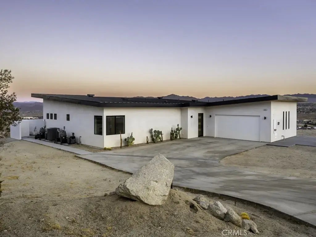 Welcome to your dream oasis in the vibrant heart of Yucca Valley! Experience the perfect blend of luxury and leisure in this 3-bedroom, 2-bathroom modern home. Nestled on a peaceful street in the highly sought-after Western Hills Estates, this exceptional home is set on two adjoining parcels of land, totaling 1.25 acres, offering both privacy and space. The second parcel provides potential for further development, if desired. Surrounded by stunning natural beauty, this home boasts breathtaking views of the mountains and city lights from every window. The backyard is an oasis, featuring a meticulously designed in-ground pool and spa, complete with Pebble Tec surface, separate pumps, heaters, and upgraded UV filtration systems. The built-in retractable covers ensure safety and cleanliness. The home's striking butterfly-design metal roof is equipped with paid solar panels, lowering both energy costs and your carbon footprint. Inside, the home showcases modern design elements, including 11-foot vaulted ceilings, 8-foot-tall doorways, exquisite tile work, and easy-to-maintain concrete floors. Abundant windows fill the home with natural light, and each morning, youll be treated to breathtaking sunrises. Multiple sliding glass doors open to the pool and spa, allowing fresh air to flow through and seamless indoor-outdoor living. This home is a stargazers paradise, offering crystal-clear night skies for celestial enthusiasts. The garage has been recently upgraded with a high-end epoxy finish, making it a perfect space for working or storing vehicles. An extra 220v outlet has been in