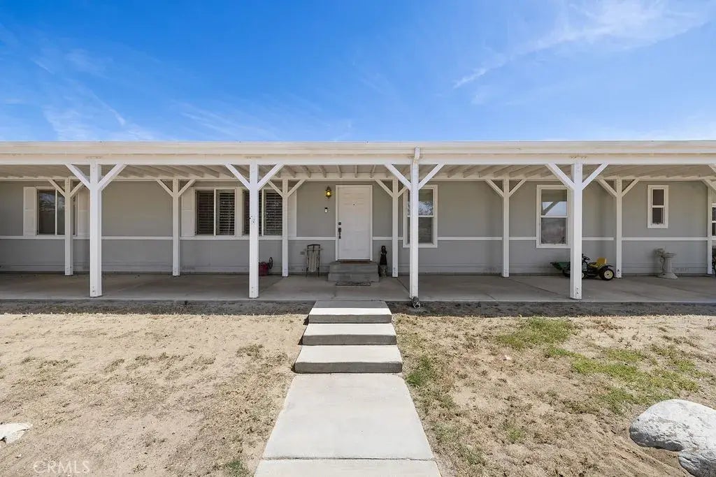 Welcome to your desert retreat. Situated on a 2.5-acre lot, this single-story ranch-style manufactured home offers approximately 1,809 sq ft of living space, with 3 bedrooms, 2 full bathrooms, and a functional layout. The covered front porch spans the full length of the home, providing shade and views of the nearby mountains. The flat, usable lot allows space for RV parking, equipment, animals, gardening, or additional structures. A detached shed/barn adds extra storage or workspace. Inside, the living room features vaulted ceilings and plantation shutters. The dining area sits next to large windows and opens into a practical kitchen with plenty of cabinets, counter space, a gas stove, microwave, and center island. A separate laundry/mudroom includes built-in shelves, coat hooks, and access to the backyard. The home includes central air, propane heat, septic system, and is fully fenced. Located in Antelope Acres, the property offers a quiet setting within a short drive to Lancaster, shopping, schools, and freeway access. Suitable for full-time living, animals, or weekend use.