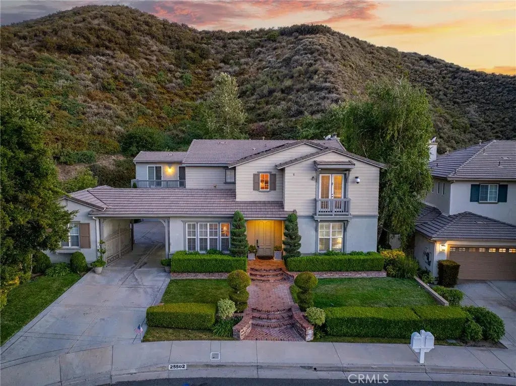 People seek out Southern Oaks in Stevenson Ranch for the large, open floorplans and hoping (hoping!) it has a pool and a big usable, private lot. Here it is! The perpetually asked for "Plan 2 Manor" home with over a third of an acre perfectly located as the last house on the cul-de-sac. Surrounded by the Santa Monica Conservancy and no rear or side neighbors. What a find! These original owners also chose the bonus room above the garage, offering a true guest house set up with full bath and private entrance. Perfect for guests or family that want separation from the main house. With this option you have 5 bedrooms in the main house with four full baths available plus the 6th bedroom/5th bath in the bonus room over the garage. Its really a terrific floorplan with an office and huge family room in the main house as well. Lots of nice features throughout - wood floors, fresh paint, shutters, huge kitchen with granite counters and walk-in pantry. The list goes on and on with OWNED solar and new HVAC to enjoy as well. True entertainers yard too with covered areas at the front and back of the yard, BBQ cook station, firepit, nice stone hardscape and huge pool/spa. In 2019 the pool was replastered & the coping redone as well. The deck off the primary offers a great vantage point for this oasis of a yard with the adjacent stairs leading to the bonus room/6th bedroom. Just a great layout all the way around. 3-car split garage behind the gate and Porto cochere, one of the signature architectural features of these John Liang homes. Southern Oaks offers a wonderful in-town location tuck