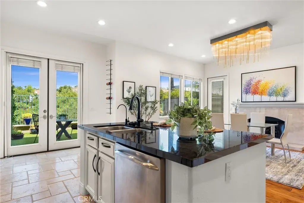 Imagine waking up every morning to sweeping golf course and hillside views in this beautifully updated Palatino home inside the guard-gated Calabasas Park Estates. From the moment you arrive, the charm is undeniablean arched entry and private gated courtyard lead you to a striking iron and glass front door. Step inside and youre welcomed by soaring 10-foot ceilings, wide-plank hardwood floors, and an open, airy layout that feels both elegant and inviting. The heart of the home is the upgraded kitchen, where youll enjoy cooking on granite counters with stainless steel appliances and gathering around the large center island. Perfectly designed for both everyday living and entertaining, the kitchen flows seamlessly into the dining and living areas, where a modern chandelier and fireplace set the tone for warm, memorable evenings with family and friends. Just beyond, three sets of French doors open to your backyard retreatlow-maintenance, with lush artificial turf, and panoramic views that stretch across the Calabasas Country Club golf course and surrounding hillsides. Upstairs, the primary suite becomes your private sanctuary, complete with its own sitting area and electric fireplace, a remodeled spa-like bathroom, and a custom walk-in closet for impeccable organization. Wake up to peaceful golf course views every day. An adjoining office/loft (formerly a fourth bedroom) offers a versatile space for work or relaxation, and can easily be restored to its original design if desired. A convenient upstairs laundry room makes daily routines effortless. With a brand-new 5-ton AC and