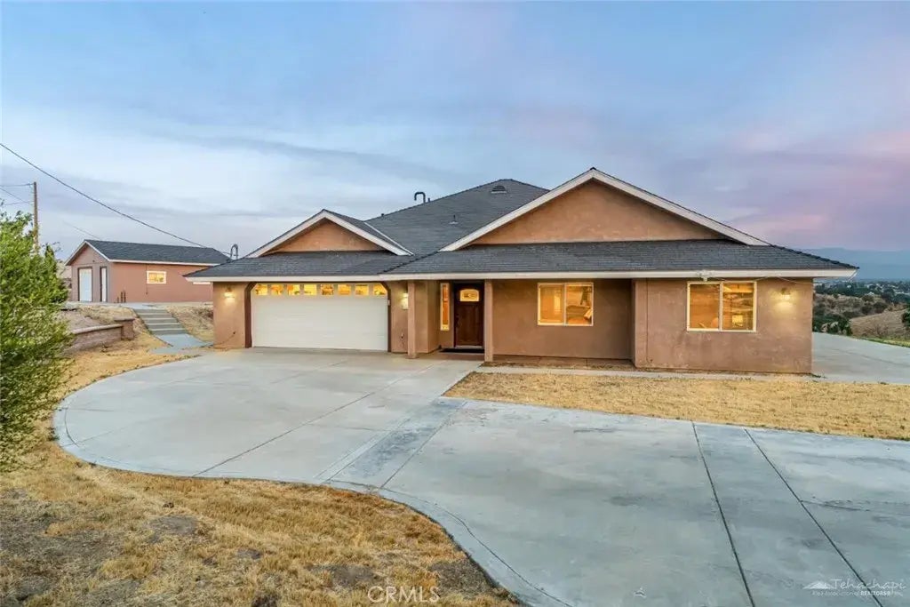 *Live Like Royalty* Welcome to Oak Knolls, located in the hills of Tehachapi which is now one of Southern California's newly accredited wine-growing regions. This peaceful 2.19-acre property offers stunning panoramic views, unforgettable sunrises and sunsets, and the tranquility of country living with four true seasons. Built in 2004, this traditional-style home offers nearly 2,200 sq ft with 4 bedrooms and 2.5 bathrooms. Inside, you'll find a functional floor plan with a spacious great room, pellet stove, and laminate wood flooring throughout the main areas. The kitchen features granite counters, a walk-in pantry, breakfast bar, stainless steel appliances including a newer oven and dishwasher, and the refrigerator is included. The recently remodeled hall bathroom includes a tiled tub/shower combo, updated tile flooring, quartz counters, and stylish raised bowl sinks. The primary suite features a large walk-in closet, soaking tub, dual sinks, a separate shower and offers rear patio access. Enjoy the outdoors on the large, stucco covered patio with lighting, perfect for relaxing or entertaining. The property also includes fruit trees, a utility shed, and a detached 24x24 garage/workshop with 220 electric and available water connection, in addition to the attached 2-car garage with epoxy floors and RV parking. A paid-off solar system adds energy efficiency, while the water softener system and central air conditioning is a great bonus. Located just minutes from town yet offering a private, rural feel, this home is ideal for buyers looking for space, comfort, and scenic beauty.