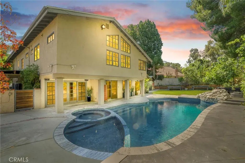 Elevated living awaits in the serene hills of Tarzana. Situated on a coveted cul-de-sac, this nearly 3,800 sq. ft. designer residence blends architectural sophistication with functional elegance. From the moment you arrive, curated landscaping and a nearly new roof set the tone for what lies within. Inside, soaring ceilings, statement windows, and bold, artistic touches create a dramatic yet inviting ambiance. A captivating built-in aquarium divides the grand living room and fireplace lounge, creating a striking focal point. The kitchen is a true showpiececrafted for those who entertain with intention. Custom cabinetry, a large marble-topped island, high-end appliances, and a walk-in pantry are all framed by an expressive backsplash and vibrant finishes. Adjacent, a sunlit formal dining room sets the stage for memorable evenings. Versatility defines the expansive layout. The large family room flows into a lower-level ensuite and an extraordinary bonus roomcurrently a salonideal as a gym, studio, private office, or guest quarters. The upper level offers a luxe primary retreat with vaulted ceilings, a reading/office niche, three walk-in closets, and a spa-caliber bath complete with soaking tub and separate shower. An additional ensuite bedroom, two more guest rooms, and a stylish full bath complete the floor. Outside, enjoy resort-style amenities including a sparkling pool and spa, grassy lawn, and a detached, powered structure perfect for creative or professional use. A rare fusion of volume, vibrancy, and visionthis is more than a home; it's a lifestyle statement.