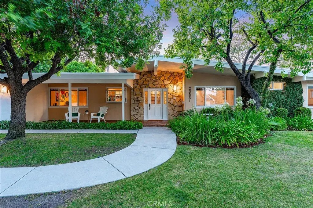 Immaculate mid-century Charles Du Bois single story pool home situated on a quiet cul-de-sac. This sweeping corner lot is privately gated & set back from the street with a sprawling front yard with rolling grass lawn, mature trees, & gated driveway that leads to the 2-car garage. A meandering pathway leads to an oversized covered front porch cladded with a natural stone entryway. A wide entry foyer has coat closet, custom wall moldings, & upgraded flooring found throughout. The entry opens directly to the spacious living & dining rooms each featuring high vaulted ceilings, gorgeous double sided stone fireplaces, Sonos audio system, & dual sets of sliding glass doors that open to the backyard for the perfect indoor/outdoor flow. The upgraded kitchen has stainless appliances, double ovens, granite countertops, great pantry space, & separate breakfast nook. The large primary bedroom features high vaulted ceiling, private access to the yard, two wardrobe closets, & en-suite completely remodeled bathroom boasting custom vanity with dual sinks, quartz counters, built-in linen storage, spa tub, separate walk-in shower with custom tiling, & access to a private side yard with manicured ivy-covered wall. Two additional well appointed bedrooms have high vaulted ceilings, large picture windows, & share a bathroom with an upgraded vanity with dual sinks, stone counter, & walk-in shower. The fourth bedroom makes for the ideal office space featuring high vaulted ceiling, closet with built-in storage shelving, & picture windows that overlook the yard. There is direct access to the 2-car fi