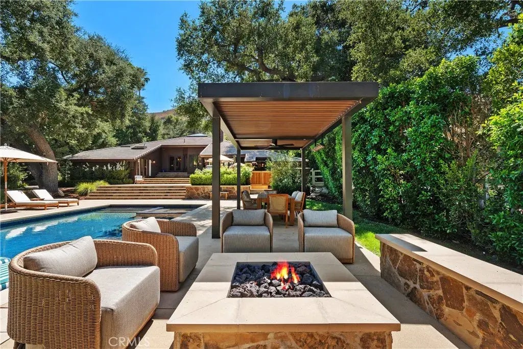 Huge price improvement, incredible value! With approximately $450,000 in upgrades including a reimagined resort style backyardperfect for entertaining, with a pebble tech pool and spa with a vaulted motorized pool cover, a sauna, an outside shower and free-standing cold plunge for ultimate relaxation. The fully equipped outdoor kitchen features top-of-the-line appliances, including a pizza oven, paired with a covered dining Struxture brand pergola with an adjustable roof for effortless al fresco gatherings. The house, inspired by Frank Lloyd Wrights iconic design principles, this stunning architectural home is nestled within the prestigious guard-gated community of Bell Canyon in Ventura County. From the moment you arrive, the homes curb appeal impresses with its extensive brickwork and meticulously maintained landscaping. Double glass doors open to a grand living room featuring a dramatic pyramid-shaped vaulted ceiling with a skylight, a slate fireplace, and a built-in aquariumcreating an unforgettable first impression. The kitchen is a chefs dream, offering custom cabinetry, granite countertops, stainless steel appliances, a center island with prep sink, and rich hardwood flooring. The breakfast area overlooks vibrant rose bushes through an expansive wall-to-wall garden window with a retractable window covering. The primary suite is a serene retreat with a sitting area, vaulted ceilings and French doors that open to the backyard. The spa-like ensuite bath offers quartz countertops, dual sinks, ample enclosed closets, a luxurious clawfoot tub, and a generous walk-in shower