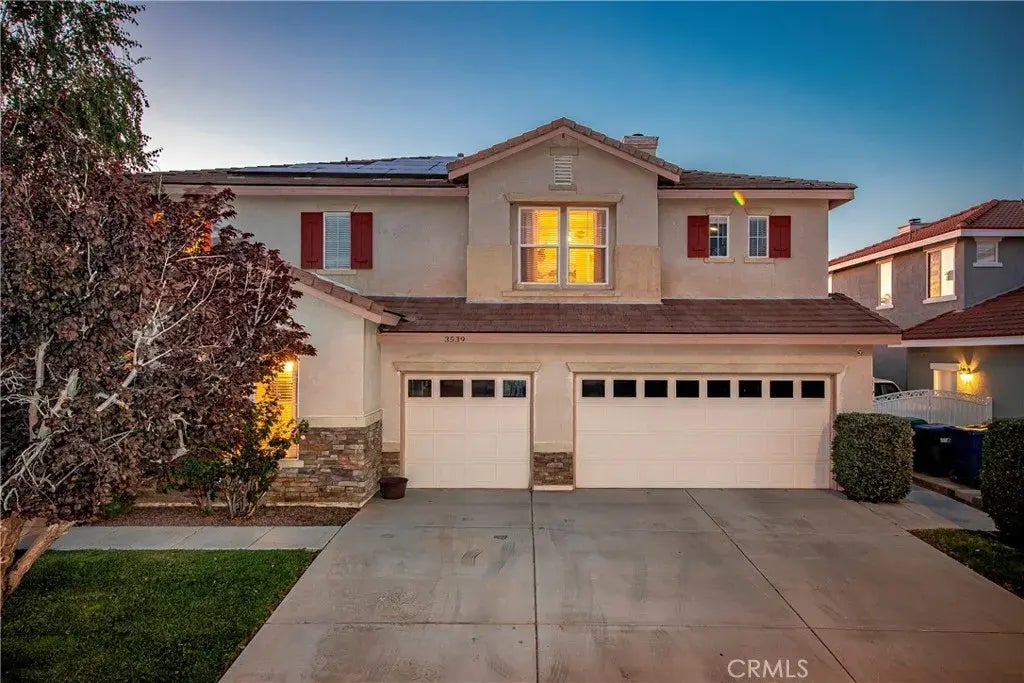 Located in the desirable Rancho Vista community of West Palmdale and within walking distance to the prestigious Rancho Vista golf course, across the street from a park and Esperanza Elementary School, this beautiful 5-bedroom, 3-bath home is waiting for you! It features a grand entrance that opens into the formal living and dining room, which offers high ceilings and plenty of natural lighting. Some notable upgrades include neutral-colored carpets, wood-plank tile flooring, custom window trim molding, ceiling fans, custom crown molding and baseboards, and recessed lighting throughout the home. One bedroom and a full bathroom on the first floor provide convenient space for guests or family members. The kitchen offers granite countertops, multiple cabinets, stainless steel appliances(refrigerator included), an island, and an additional dining area. The family room offers a large mantle with a surrounding tile fireplace and a built-in cabinet. On the second floor, you have the four other good-sized bedrooms. The primary bathroom includes granite countertops, dual vanity sinks, a separate makeup vanity, a standalone shower, a garden tub, and two walk-in closets with built-in organizers. All three additional bedrooms feature spacious closets, with two offering walk-in closets. The guest bathroom has dual vanity sinks and a tub/shower enclosure. The large upstairs laundry room includes built-in cabinets and a washer/dryer. Step out to the well-manicured backyard where you'll find a patio with an area fully covered and the other with a lattice finish, great for entertaining or enj