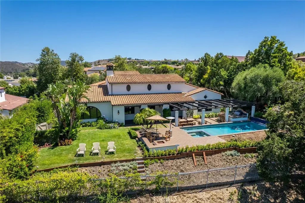 Inside the guard-gated Oaks of Calabasas, this single-level Spanish showpiece unites timeless Mediterranean character with modern comfort and unprecedented panoramic mountain vistas. An arched wrought-iron gate opens to a bougainvillea-lined courtyard. Beyond, vaulted beamed ceilings, terra-cotta floors and expansive picture windows fill the great room, formal dining area and chefs kitchen with light. The kitchen anchors the home with pro-grade stainless appliances, an oversized island with bar seating, walk-in pantry and sunny breakfast nook. A private bedroom wing hosts an indulgent primary retreat featuring a soaking tub, large shower, water closet, dual vanities and a boutique-style walk-in closet. Three additional en-suite bedrooms flank a generous bonus/game room, plus a maids quarters and a separate courtyard-facing room flexes easily as an office, library or gym. A separate, private, dedicated home theater, caters to movie nights. Glass doors usher you to the resort-style backyard: pool, spa and multiple lounge and dining patios set against mountain viewsideal for effortless indoor-outdoor living. Residents enjoy top-tier community amenities: clubhouse, tennis and sport courts, Olympic-size pool, spa, professional gym and more. Moments from The Commons boutiques, dining and theaters and served by the acclaimed Las Virgenes School District, this property delivers elevated suburban living with city conveniences close at hand.