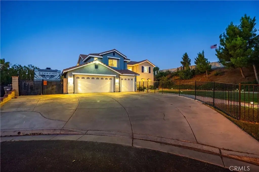 ***LIVE BEAUTIFULLY*** Welcome to this stunning six-bedroom estate located in the highly desirable, family-friendly gated community of Bella Vista in West Palmdale. Perfectly situated on a quiet cul-de-sac and set on over half an acre, this impressive property offers the perfect blend of luxury, comfort, and privacy. From the moment you arrive, the gated front yard, three-car garage, paved RV access, and striking custom wrought iron double entry doors set the tone for the elegance found throughout the home. Inside, soaring high ceilings and abundant natural light greet you at the entry, highlighting the grand double adjoining staircase. The formal living room provides a sophisticated space for entertaining, while the spacious family room features a cozy fireplace, custom mantle, and built-ins. A downstairs bedroom with backyard access and a full bath add convenience for guests or multigenerational living. The spacious kitchen is a delight, showcasing granite counters, a six-burner stove with a custom hood vent, stainless steel appliances, a large pantry, and a generous center island with wraparound barstool seating. Crown molding, plantation shutters, and new tile flooring enrich the home with timeless character and modern upgrades. Upstairs, the primary suite offers a luxurious retreat with vaulted ceilings, a sitting area (formerly the sixth bedroom, which can easily be converted back), and direct access to an expansive private balcony with breathtaking views. The remodeled primary bath features granite counters, upgraded tile flooring and backsplash, dual modern vanities
