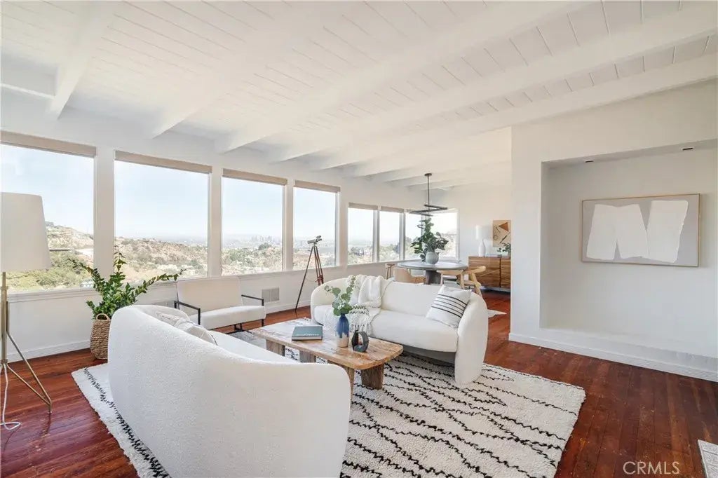 This private Spanish Villa in Laurel Canyon, situated within the desirable Wonderland School District, boasts breathtaking, unobstructed views of downtown and the surrounding canyon. Flooded with natural light, this secluded home offers expansive panoramic vistas from nearly every room, including the vast rooftop deck complete with a wet bar ideal for both unwinding and hosting gatherings. Step through the gated courtyard and into the open-plan main floor, where you'll find hardwood floors, post and beam ceilings, and continuous wall-to-wall windows that perfectly frame the stunning scenery. The kitchen features stainless steel appliances and a charming built-in breakfast nook, providing direct access to either the courtyard or the rooftop, perfect for enjoying your morning coffee or dining al fresco. A powder room and the primary bedroom suite, which includes an en-suite bathroom and generous closet space, are also conveniently located on this level. The second level, accessible via a direct entry and a separate private entrance, is a self-contained space designed for entertainment. It features a built-in bar, a comfortable lounge area, and a second bedroom with its own en-suite bathroom. The third bedroom is situated on the bottom floor and includes a bonus room, offering versatile space that could serve as a home office, gym, or creative studio. This lower level also has a powder room and a separate entrance. For parking convenience, the property includes a two-car attached garage, a driveway with space for two additional vehicles, and further off-street parking. This t
