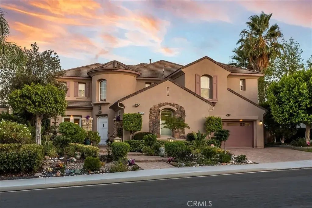 Welcome to this Executive Pool Home, perfectly situated in the prestigious Torcello tract at the top of Stevenson Ranch. A picturesque tree-lined street leads you to this stunning home with incredible VIEWS and curb appeal. A private courtyard with a grand fountain, beautifully pavered driveway and walk ways sets the tone for the pride of ownership youll find throughout. This former model home offers 5 bedrooms, 5 bathrooms, and an impressive 4,124 sq. ft. of thoughtfully designed living space blending elegance, functionality, and comfort. Inside, a grand rotunda entry with soaring ceilings and beautiful Versailles patterned tile welcomes you. Natural light pours in through oversized windows, highlighting the inviting paint selections and open layout. The chefs kitchen is a true centerpiece, featuring abundant cabinetry, huge center island, granite counters and backsplash, a stylish light fixture, butlers pantry, and walk-in pantry. Entertain with ease in the formal living and dining rooms, both with views of the lush landscape, or relax in the family room with its custom built-in media center, elegant fireplace, and views of the backyard. The main level also offers a private guest suite with ensuite bath, a home office with custom built-ins, a powder room with designer wallpaper, a large laundry room, and generous storage. Upstairs, the luxurious primary suite is a true retreat with sweeping mountain views, two walk in closets with custom organizers, and a separate lounge area perfect for a sitting room, office, or gym. The spa-like ensuite bath boasts dual vanities, a mak