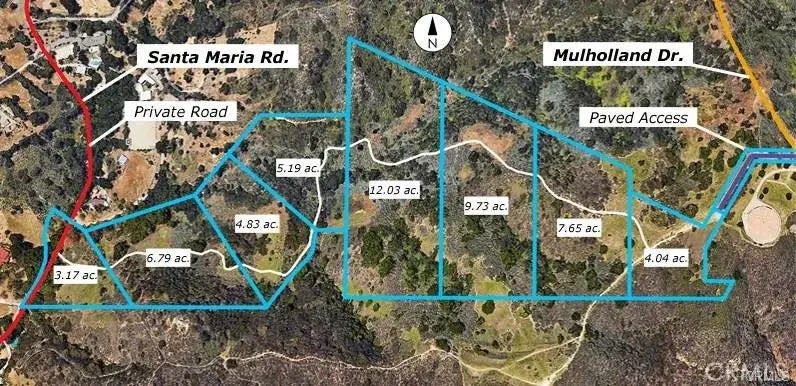 Fantastic!! One of a kind and one of the last large multi-parcel properties left in the area! Significant mountain acreage totaling approx. 54 acres consisting of 8 legal parcels (4434-008-008, 010, 011, 012 and 4434-007-032, 033, 034, 035). All lots are contiguous and have Certificates of Compliance. Property is uniquely located with direct access just mins from both Ventura Blvd. in the Valley via Mulholland Dr., and from PCH via Topanga Cyn on Santa Maria Road (private road). Property includes additional parcel (4434-001-012) with paved access. There are spectacular panoramic views of the Valley and surrounding parklands, with multiple naturally occurring potential building sites either for a pocket development, multi-home compound or secluded private estate. Property is also well suited for equestrian use/horse stables and is adjacent to Fair Hills Polo Club. The land is great for agricultural use, micro-vineyards, and/or recreational use.