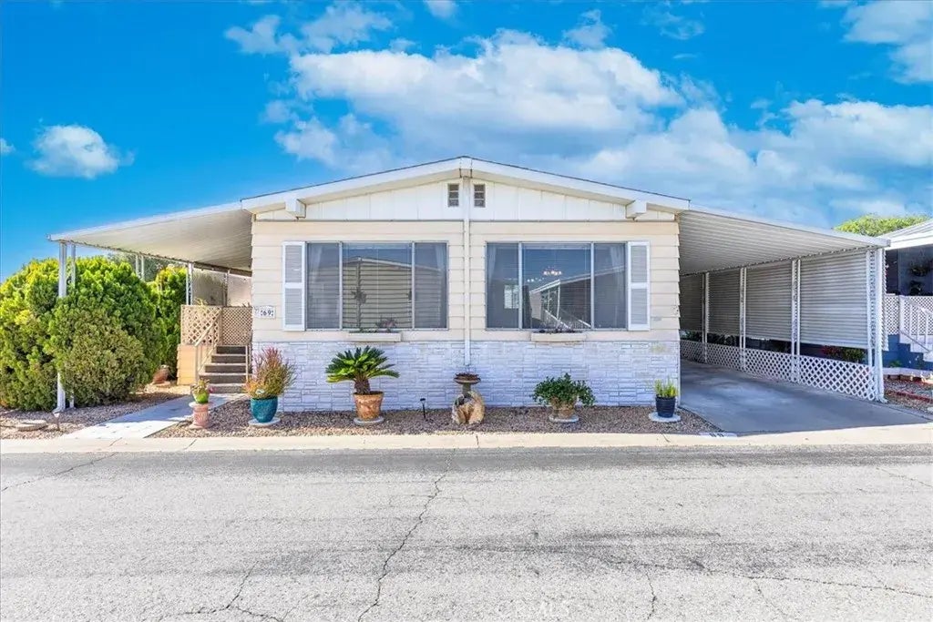 55+ Hillside Mobile Home Estates - Gated community - CLEAN/TURNKEY - 2 Bedrooms/ 2 Baths - Triple-wide Silvercrest manufactured home with approximately 1,680 square feet. Open floor plan with large living/dining great room with built-in hutch. Kitchen with four burner gas stove top - dishwasher - newer built-in oven - disposal & vinyl flooring. Lots of cabinet/counter space & breakfast bar that opens to a family room with built-in shelving/desk storage, bay window, dry bar & slider door to covered front porch. Primary bedroom with carpet & large walk-in closet with mirrored doors. Primary bath with separate soaking tub & walk-in shower, dual sink vanity. Guest bedroom with carpet, wardrobe closet. Hallway bath with walk-in shower & single sink.. Indoor laundry includes with washer & dryer. Additional features include; Neutral interior paint, custom window treatments, window blinds, lighted ceiling fans, central AC & Heat, newer carpet/water heater/roof. Large covered front porch with privacy lattice, low maintenance yard. Detached storage shed within the covered carport & driveway. Community amenities include - Club House - Community Pool - Fitness Area - Billiards/Game Room - Sports Court - BBQ & Picnic Area. Conveniently located close to freeways, shopping, restaurants & more.