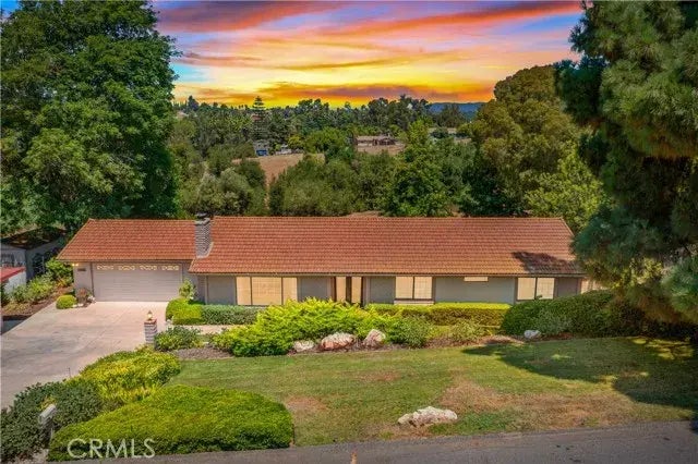 This is the charming, single story view home on land that you have been waiting for!!! Tucked away at the end of a quiet, private lane on more than a half acre of verdant, usable land, this home provides a haven of peace and tranquility with no rear neighbors. Upon entering you are greeted by the foyer with gleaming coffee colored engineered wood floors that lead to the sunlit living room with windows overlooking the front yard, a cozy fireplace and beautiful beamed ceiling. Step further inside to the dining room with slider to the outdoors and open to the recently remodeled kitchen with stainless steel KitchenAid appliances (including a gas cooktop), refreshed cabinets and quartz countertops. The garage has been converted into a large family room/bonus room that provides an extra 360 sf of finished living space to enjoy - and can be converted back. Adjacent is a room with extra storage/pantry space as well as the washer and dryer. But it is the outdoors that truly beckons. Just off the dining room and kitchen is a generously sized covered patio that affords views of the lushly landscaped backyard and the sylvan meadow beyond. To the right, a flagstone path leads to a jacuzzi that is also just off the primary suite. To the left, a walkway meanders to the incredible orchard that has been lovingly tended and planted with every kind fruit tree imaginable, including apple, orange, blood orange, lemon, cherry, pomegranate, apricot, grapefruit and avocado as well as specimen pine trees. A lazily turning windmill, large 12/x20 shed and chicken coop complete this picture of pastora