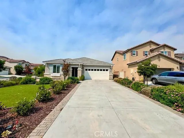 This beautiful single story home in the highly sought after Audie Murphy Ranch community of Menifee boasts a perfect blend of elegance, functionality, and charm. With 3 bedrooms, 2.5 bathrooms, and over 2,200 sqft of living space, it sits on a spacious corner lot with exceptional curb appeal, featuring a long driveway and beautifully maintained, low-maintenance landscaping. Upon entering, you'll notice the light, neutral paint scheme paired with stylish plank flooring, enhancing the welcoming atmosphere. Two bedrooms and a full bathroom are conveniently located near the entrance. As you walk further down the hall, you'll discover a den, additional storage, and a half bathroom. The rear of the home embraces an open concept design, where the large kitchen seamlessly connects to both the dining and family rooms. The kitchen is a highlight with dark oak cabinets offering ample storage, a custom backsplash, sleek granite countertops, stainless steel appliances, and an oversized pantry. The laundry room, complete with a washer and dryer, is conveniently located adjacent to the family room. The primary bedroom is a serene retreat with plenty of space, an ensuite bathroom with dual sinks, a shower, a linen storage closet, and a spacious walk in closet. Head outside to your private oasis with a large covered patio, artificial turf, a putting green, an open patio area, and lush greenery, making it perfect for relaxing and entertaining year-round. The Audie Murphy Ranch community offers tons of amenities and is in very close proximity to schools, parks, shopping, and dining and more.