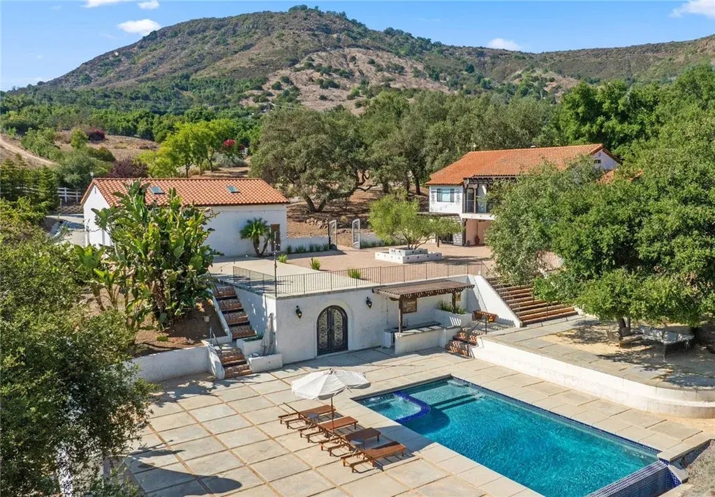 Back on the market through no fault of sellers - Nestled in the picturesque De Luz area, this private estate with a vineyard is a newly renovated luxury modern Spanish home featuring 5-bedrooms, 6-bathrooms spanning 3,585 sq. ft. and sits on 9.1 acres of private land. This custom home offers a seamless blend of elegance and functionality, perfect for those seeking a peaceful retreat. A sweeping staircase leads to the main living area upstairs, where the Spanish contemporary design shines with custom upgrades and an open, airy feel. The home has been featured on social media showcasing its unique blend of luxury and charm. The upper level features 3 spacious bedrooms, 2 bathrooms, high ceilings, and an inviting dining room and kitchen. Stacking doors open up to a 30-foot balcony, offering breathtaking views of the surrounding landscape. The lower level is a private oasis, ideal for an in-law suite, complete with its own bedroom, bathroom, and living space. Additional rooms downstairs each have their own French doors to the outside grounds and provide flexible options for an art or yoga studio, private office or writers retreat. The home includes generous storage and two laundry hookups. Ancient rare Engleman Oaks showcase the property with its' history and beauty. A seasonal creek weaves its way through the trees with gorgeously crafted bridges placed about. The property boasts towering oak trees, three varieties of grapevines, apple, lemon, orange, grapefruit, persimmon, peach, plum and avocado trees. The outdoor area is a true paradise, featuring Spanish tile, a mineral in