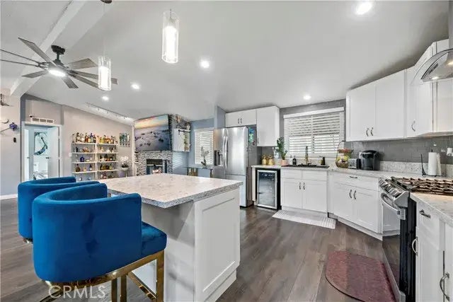Welcome to this fully renovated home. Conveniently situated near the 60 and 15 freeways and The Shops at Jurupa Valley, the home is located in the gated and family-friendly Bravo Estates community, which offers a variety of amenities for all ages, including a clubhouse, swimming pool, playground, billiards room, RV and boat storage, and the convenience of on-site staff. The clubhouse is also available for special events such as birthday parties, weddings, and conferences, and can be reserved with a request. This beautifully upgraded, open-concept manufactured home features three bedrooms and two bathrooms. Step into a fully remodeled kitchen complete with new white cabinets, quartz countertops, pendant lighting over the kitchen island, a sleek stainless-steel stove vent hood, a single-hole pre-rinse pull-down faucet, and recessed lighting throughout. Enjoy the warmth and ambiance of a gas starter wood-burning fireplace, perfect for cozy evenings. The home also boasts copper plumbing throughout, hardwood floors, and waterproof laminate flooring in the upgraded bathrooms. Additional upgrades include brand-new energy-efficient windows, new blinds throughout, and an AC unit replaced in 2021. Outside, unwind on the inviting patio or enjoy the spacious backyardideal for gatherings or a quiet coffee in the mornings. The backyard is fitted with high-quality synthetic grass, ensuring low maintenance and year-round greenery.